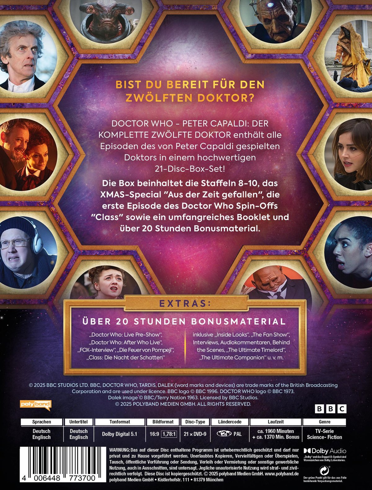 "Doctor Who - Peter Capaldi: Der komplette 12.Doktor" enthält alle Folgen des von Peter Capaldi gespielten Doktors in einem hochwertigen 21-Disc-DVD-Box-Set mit Schuber und Booklet.