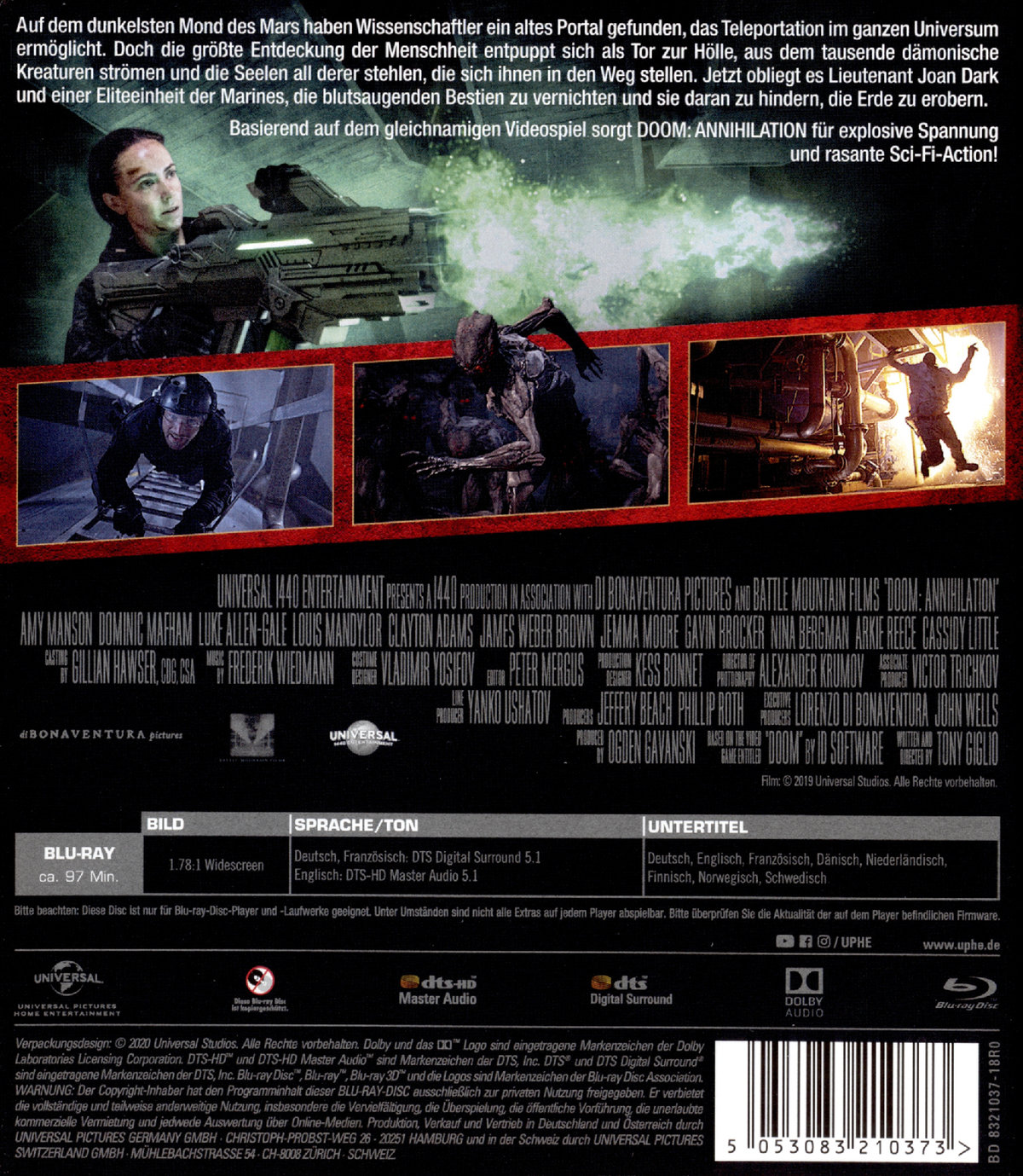 Auf dem dunkelsten Mond des Mars haben Wissenschaftler ein altes Portal gefunden, das Teleportation im ganzen Universum ermöglicht. Doch die größte Entdeckung der Menschheit entpuppt sich als Tor zur Hölle, aus dem tausende dämonische Kreaturen strömen und die Seelen all derer stehlen, die sich ihnen in den Weg stellen. Jetzt obliegt es Lieutnant Joan Dark und einer Eliteeinheit der Marines, die blutsaugenden Bestien zu vernichten und sie daran zu hindern, die Erde zu erobern.Basierend auf dem gleichnamigen Videospiel sorgt "Doom: Annhilation" für explosive Spannung und rasante Sci-Fi-Action!