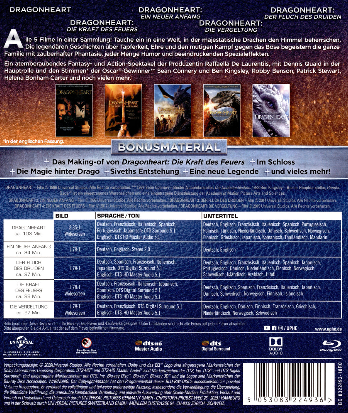 Alle 5 Filme in einer Sammlung! Tauche ein in eine Welt, in der majestätische Drachen den Himmel beherrschten. Die legendären Geschichten über Tapferkeit, Ehre und den mutigen Kampf gegen das Böse begeistern die ganze Familie mit zauberhafter Phantasie, jeder Menge Humor und beeindruckenden Spezialeffekten.Ein atemberaubendes Fantasy- und Action-Spektakel der Produzentin Raffaella De Laurentiis, mit Dennis Quaid in der Hauptrolle und den Stimmen* der Oscar®-Gewinner Sean Connery und Ben Kingsley, Robby Benson, Patrick Stewart, Helena Bonham Carter und noch vielen mehr.*in der englischen Fassung.