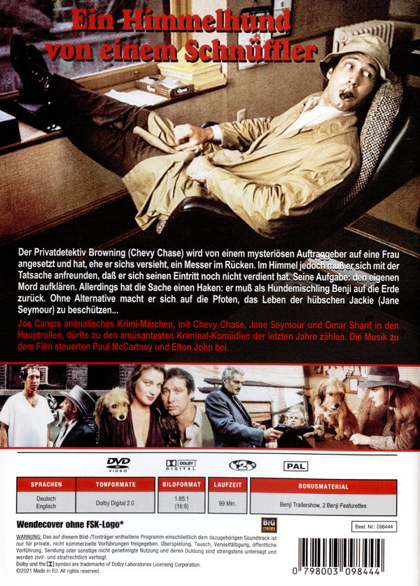 Detektive, die selbst schwierige Fälle mit eleganter Lässigkeit lösen, gibt es zuhauf. Diejenigen aber, die sogar ihren eigen Mordfall aufklären, sind selten. Einer von ihnen: Benjamin Brownin, ein junger Londoner Detektiv. Kaum hat der Leibwächter den Schutz der attraktiven Patricia übernommen, wird diese auch schon meuchlings ermordet, er selbst folgt ihr mit einem Messer im Rücken wenig später ins Nirvana nach. Doch der Himmel hat für ihn eine Überraschung parat. Da weder der Mord an Patrizia noch an ihm geklärt ist, wird Benjamin kurzerhand auf die Erde geschickt, allerdings in Gestalt eines Hundes und mit dem Kosenamen Benji versehen. Mit Unterstützung einer ehrgeizigen Boulevard Journalistin nimmt der kriminalitische Vierbeiner die Fahndung auf. Nach einigen geradezu viehischen Verwicklungen und amourösen Abenteuern ist er den Tätern auf der Spur, gelingt es ihm nicht zuletzt durch seinen tierischen Riecher den Fall zu lösen.