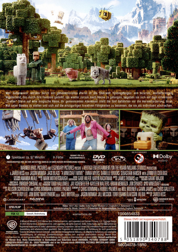Willkommen in der Welt von Minecraft, in der Kreativität nicht nur beim Gestalten hilfreich ist, sondern sogar überlebenswichtig!Die vier Außenseiter Garrett "The Garbage Man" Garrison (Momoa), Henry (Hansen), Natalie (Myers) und Dawn (Brooks) schlagen sich mit ganz gewöhnlichen Problemen herum. Doch eines Tages werden sie durch ein geheimnisvolles Portal in die Oberwelt hineingesogen: ein bizarres, würfelförmiges Wunderland, das durch ihre Fantasie gedeiht. Um wieder zurück nach Hause zu gelangen, müssen sie diese Welt überwinden - und sich gegen bösartige Wesen wie Piglins und Zombies zur Wehr setzen. Unerwartete Unterstützung erhalten sie auf ihrer fantastischen Suche von Steve (Black), einem erfahrenen "Crafter".Ihr gemeinsames Abenteuer stellt die fünf Gefährten vor die Herausforderung, Mut zu beweisen und sich auf die kreativen Qualitäten zu besinnen, die jeden Einzelnen von ihnen ausmachen - denn genau diese Eigenschaften brauchen sie, um auch in der realen Welt erfolgreich zu sein.