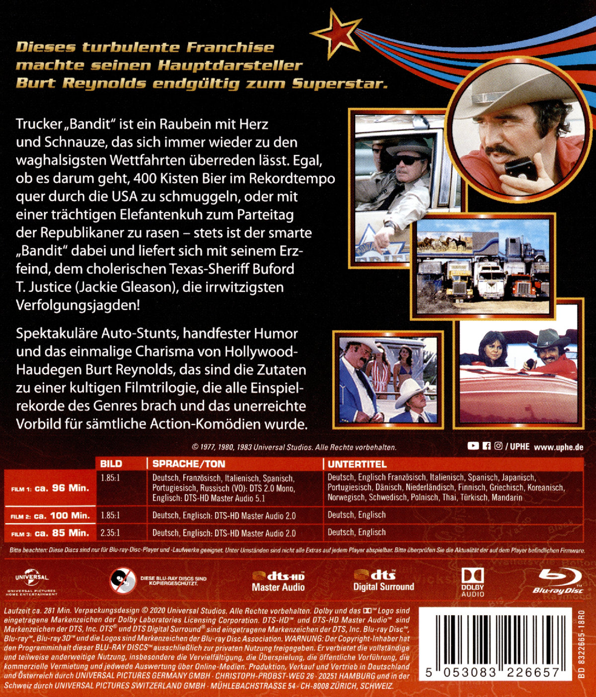 Spektakuläre Auto-Stunts, handfester Humor und das einmalige Charisma von Hollywood-Haudegen Burt Reynolds. Das sind die Zutaten zu einer kultigen Filmtrilogie, die alle Einspielrekorde des Genres brach und das unerreichte Vorbild für sämtliche Action-Komödien wurde.Ein ausgekochtes SchlitzohrFür eine Belohnung von 80.0000 Dollar übernimmt Bandit (Burt Reynolds) gemeinsam mit seinem Freund Cledus den Auftrag, innerhalb von 28 Stunden 400 Kisten Bier illegal von Texas nach Atlanta zu schaffen. Damit der von Cledus gesteuerte Truck freie Fahrt hat, versucht Bandit mit seinem schwarzen Trans Am die Aufmerksamkeit der Polizei auf sich zu ziehen. Brenzlig wird es jedoch erst, als Bandit die Anhalterin Carrie mitnimmt: Carrie hat gerade die Hochzeit mit dem Sohn von Sheriff Buford T. Justice platzen lassen, was der Schwiegervater in spe gar nicht lustig findet.Ein ausgekochtes Schlitzohr ist wieder auf AchseUnd wieder hält Burt Reynolds als rasender "Bandit" den von Jackie Gleason bestens verkörperten "Sheriff des Südens" zum Narren. Diesmal gilt es, eine trächtige Elefantenkuh ihrem Bestimmungsort zuzuführen.Ein ausgekochtes Schlitzohr 3Im dritten Film der großen Action-Comedy-Serie sind es die üblen Ensie-Brüder, die Bandits Erzfeind Sheriff Buford T. Justice (Jackie Gleason) dazu bringen wollen, in weniger als 24 Stunden ein außergewöhnliches Spezialgut von Miami nach Texas zu bringen.