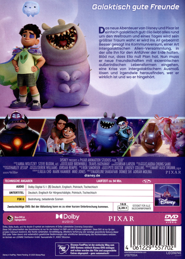 Das neue Abenteuer von Disney und Pixar ist einfach galaktisch gut! Elio liebt alles rund um den Weltraum und eines Tages wird sein größter Traum wahr: er wird ins All gebeamt! Besser gesagt ins Kommuniversum, einer Art intergalaktischen Alien-Versammlung, in der alle ihn für den Anführer der Erde halten. Blöd nur, dass Elio null Plan hat. Nun muss er neue Freundschaften mit exzentrischen außerirdischen Lebensformen eingehen, eine Krise von intergalaktischem Ausmaß lösen und irgendwie herausfinden, wer er wirklich ist und wo er hingehört.