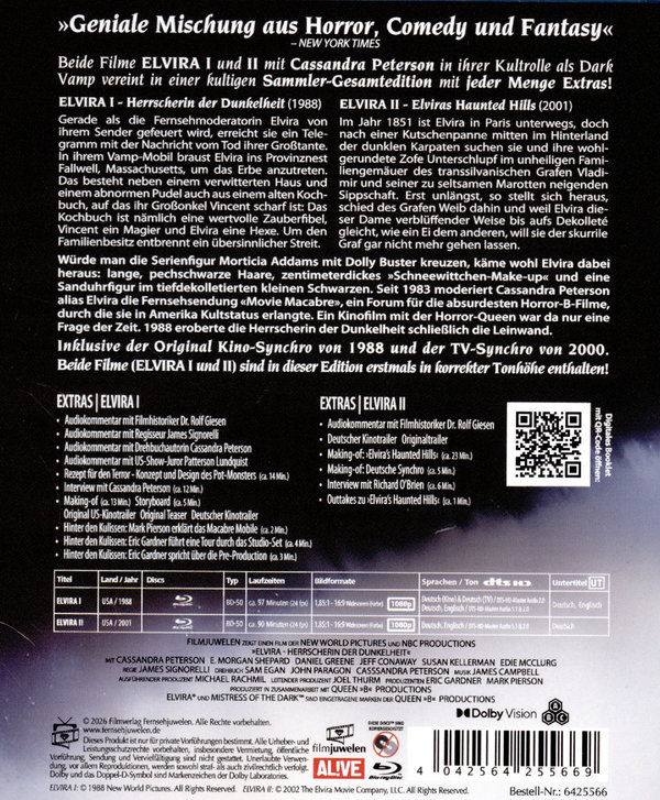 Elvira, dem Vamp erster Klasse, ausgeflippt und supersexy, bekannt als Grusel-Ikone des US-Fernsehens, kommt die Erbschaft einer Großtante gerade recht, um ihre geplante Show in Las Vegas zu finanzieren. Aber sie hat nicht mit den okkulten Machenschaften ihres Großonkels gerechnet, der sie auf dem Scheiterhaufen brennen sehen will. Würde man die Serienfigur Morticia Addams mit Dolly Buster kreuzen, käme wohl Elvira dabei heraus: lange, pechschwarze Haare, zentimeterdickes »Schneewittchen-Make-up« und eine Sanduhrfigur im tiefdekolletierten kleinen Schwarzen. Seit 1983 moderiert Cassandra Peterson alias Elvira die Fernsehsendung «Movie Macabre», ein Forum für die absurdesten Horror-B-Filme, durch die sie in Amerika Kultstatus erlangte. Ein Kinofilm mit der Horror-Queen war da nur eine Frage der Zeit. 1988 eroberte die Herrscherin der Dunkelheit schließlich die Leinwand. Enthält beide Filme: ELVIRA I - Herrscherin der Dunkelheit (1988) ELVIRA II - Elvira's Haunted Hills (2001) Inhalt Teil 1: Gerade als die Fernsehmoderatorin Elvira von ihrem Sender gefeuert wird, erreicht sie ein Telegramm mit der Nachricht vom Tod ihrer Großtante. In ihrem Vamp-Mobil braust Elvira ins Provinznest Fallwell, Massachusetts, um das Erbe anzutreten. Das besteht neben einem verwitterten Haus und einem abnormen Pudel auch aus einem alten Kochbuch, auf das ihr Großonkel Vincent scharf ist: Das Kochbuch ist nämlich eine wertvolle Zauberfibel, Vincent ein Magier und Elvira eine Hexe. Um den Familienbesitz entbrennt ein übersinnlicher Streit.