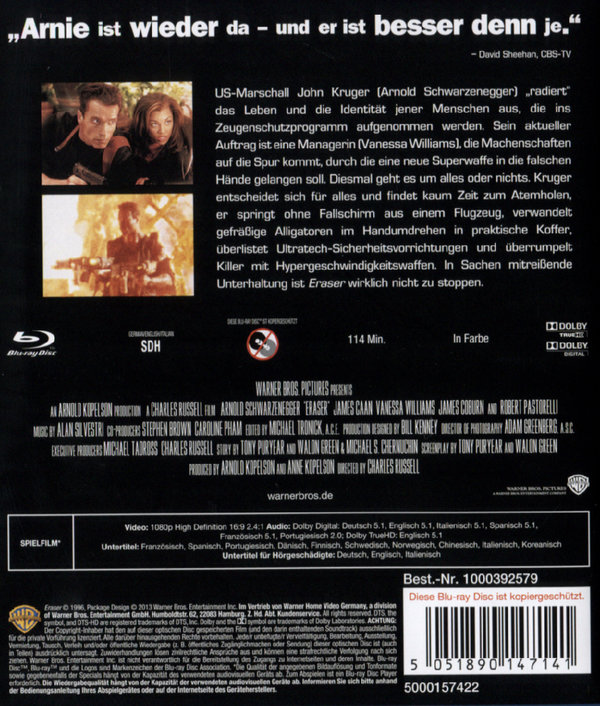 Eraser ist ein sehr guter Schwarzenegger Film und jedem Fan zu empfehlen. Die Bildqualität der Blu ray ist in Ordnung,der Film ist Uncut
