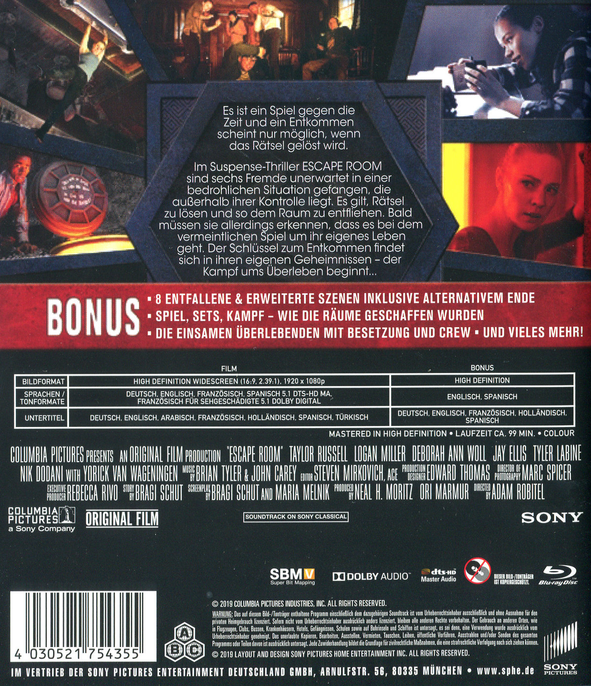 Es ist ein Spiel gegen die Zeit und ein Entkommen scheint nur möglich, wenn das Rätsel gelöst wird. Im Suspense-Thriller ESCAPE ROOM sind sechs Fremde unerwartet in einer bedrohlichen Situation gefangen, die außerhalb ihrer Kontrolle liegt. Es gilt, Rätsel zu lösen und so dem Raum zu ent? iehen. Bald müssen sie allerdings erkennen, dass es bei dem vermeintlichen Spiel um ihr eigenes Leben geht. Der Schlüssel zum Entkommen ? ndet sich in ihren eigenen Geheimnissen – der Kampf ums Überleben beginnt...