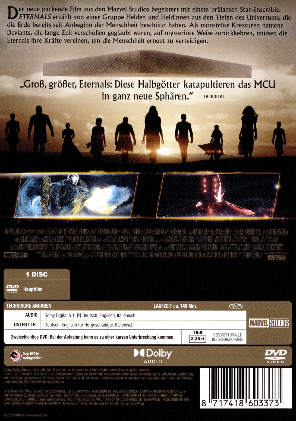 Der neue packende Film aus den Marvel Studios begeistert mit einem brillanten Star-Ensemble. ETERNALS erzählt von einer Gruppe Helden und Heldinnen aus den Tiefen des Universums, die die Erde bereits seit Anbeginn der Menschheit beschützt haben. Als monströse Kreaturen namens Deviants, die lange verschollen geglaubt waren, auf mysteriöse Weise zurückkehren, müssen die Eternals ihre Kräfte vereinen, um die Menschheit erneut zu verteidigen.