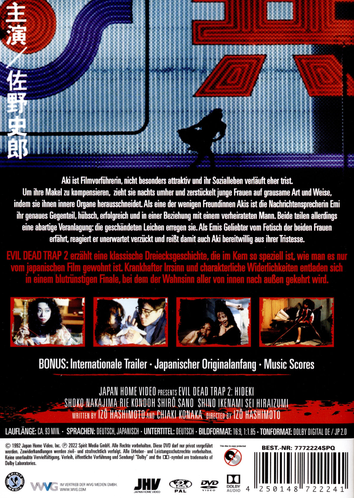 EVIL DEAD TRAP 2 erzählt eine klassische Dreiecksgeschichte, die im Kern so speziell ist, wie man es nur vom japanischen Film gewohnt ist. Krankhafter Irrsinn und charakterliche Widerlichkeiten entladen sich in einem blutrünstigen Finale, bei dem der Wahnsinn aller von innen nach außen gekehrt wird.