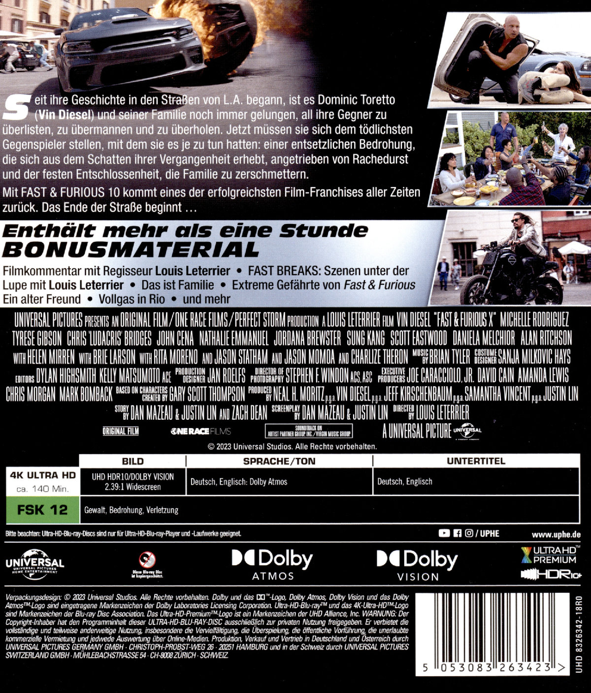 Seitdem ihre Geschichte in den Straßen von L.A. begann, ist es Dominic Toretto (Vin Diesel) und seiner Familie noch immer gelungen, all ihre Gegner, zu überlisten, zu übermannen und zu überholen. Jetzt müssen sie sich dem tödlichsten Gegenspieler stellen, mit dem sie es je zu tun hatten: eine entsetzliche Bedrohung, die sich aus dem Schatten ihrer Vergangenheit erhebt, angetrieben vom Durst nach Rache und fest entschlossen, die Familie zu zerschmettern. Mit "Fast & Furious 10" kommt eines der erfolgreichsten Film-Franchises aller Zeiten zurück. Das Ende der Straße beginnt ...