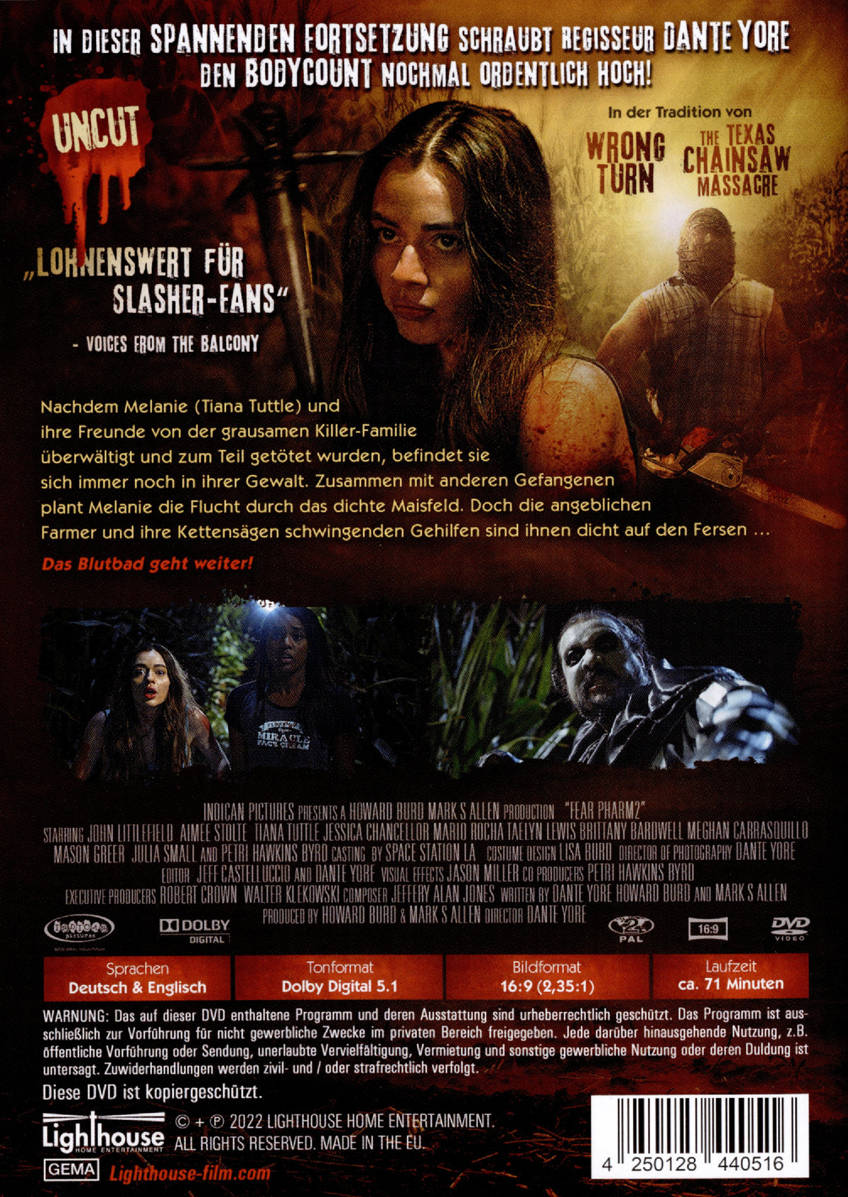 Nachdem Melanie (Tiana Tuttle) und ihre Freunde von der grausamen Killer-Familie überwältigt und zum Teil getötet wurden, befindet sie sich immer noch in ihrer Gewalt. Zusammen mit anderen Gefangenen plant Melanie die Flucht durch das dichte Maisfeld. Doch die angeblichen Farmer und ihre Kettensägen schwingenden Gehilfen sind ihnen dicht auf den Fersen … Das Blutbad geht weiter!