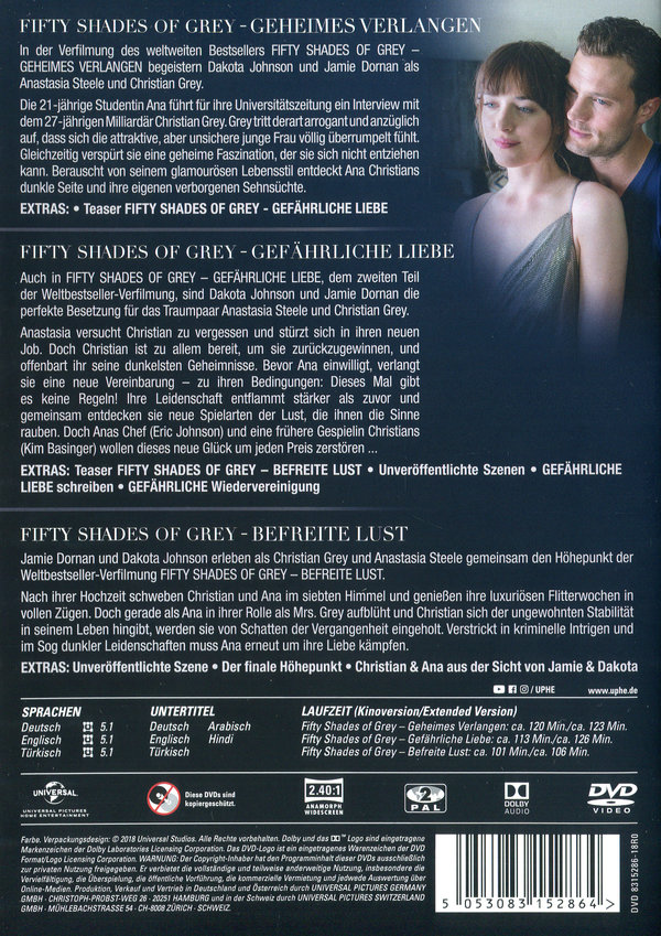 "Fifty Shades Of Grey - Befreite Lust" Jamie Dornan und Dakota Johnson erleben als Christian Grey und Anastasia Steele gemeinsam den Höhepunkt der Weltbestseller-Verfilmung "Fifty Shades Of Grey - Befreite Lust". Nach ihrer Hochzeit schweben Christian und Ana im siebten Himmel und genießen ihre luxuriösen Flitterwochen in vollen Zügen. Doch gerade als Ana in ihrer Rolle als Mrs. Grey aufblüht und Christian sich der ungewohnten Stabilität in seinem Leben hingibt, werden sie von Schatten der Vergangenheit eingeholt. Verstrickt in kriminelle Intrigen und im Sog dunkler Leidenschaften muss Ana erneut um ihre Liebe kämpfen. Enthält die unverschleierte Fimversion (DVD 106 Min./ Blu-ray/UHD 110 Min.) und die Original-Kinofassung (DVD 101 Min./ Blu-ray/UHD 105 Min.)!