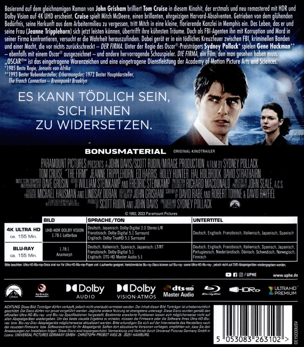 In diesem, nach dem gleichnamigen internationalen Bestseller gedrehten Film zeigt Tom Cruise die großartigste schauspielerische Leistung seiner bisherigen Karriere. Cruise spielt Mitch McDeere, einen brillanten ehrgeizigen Harvard-Absolventen. Getrieben von dem glühenden Verlangen, seine Herkunft aus dem Arbeitermilieu zu vergessen, tritt Mitch in eine kleine, florierende Kanzlei in Memphis ein. Das Leben, das er und seine Frau sich jetzt leisten können, übertrifft ihre kühnsten Träume. Doch als FBI-Agenten ihn mit Korruption und Mord in seiner Firma konfrontieren, versucht er die Wahrheit herauszufinden. Dabei gerät er in ein tödliches Kreuzfeuer zwischen FBI, kriminellen Banden und einer Macht, die vor nicht zurückschreckt - DER FIRMA.
