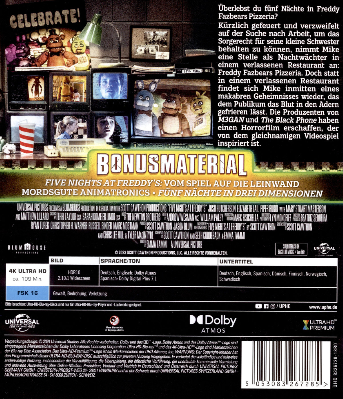 Überlebst du fünf Nächte in "Freddy Fazbear's Pizza"? Aus dem schockierenden Horror-Game-Phänomen wird jetzt eine Horrorperle, die dem Publikum das Blut in den Adern gefrieren lässt.Mike Schmidt tritt bei "Freddy Fazbear's Pizza!" einen Posten als Nachtwächter an. Doch gleich im Verlauf der ersten Nacht muss er erkennen, dass die Nachtschicht in dem verlassenen Restaurant alles andere als ruhig werden wird.
