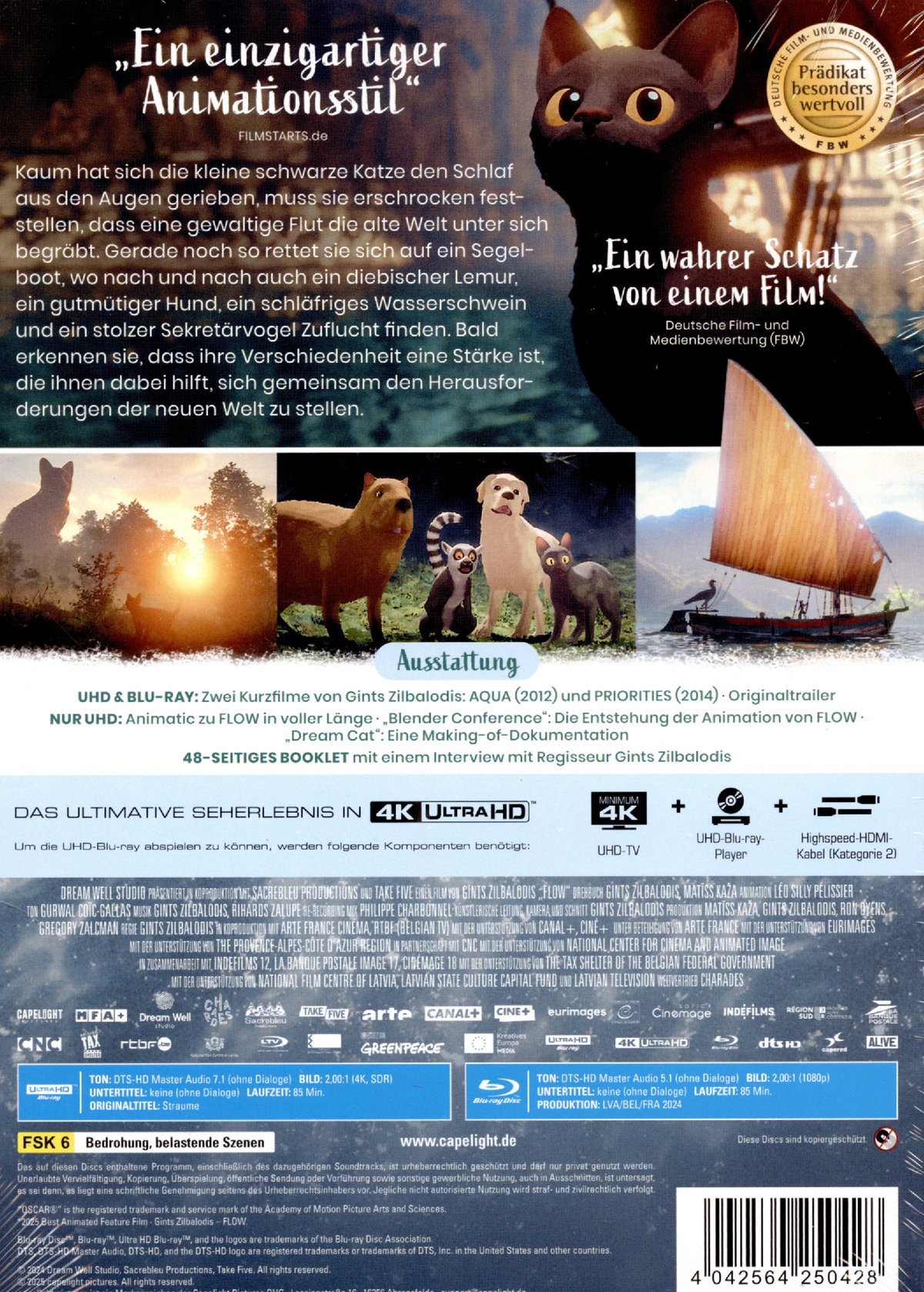 Limitiertes Mediabook mit dem Film auf UHD-Blu-ray (in 4K Ultra HD); auf Blu-ray und einem 48-seitigen Booklet mit einem Interview mit Regisseur Gints ZilbalodisUHD-Blu-ray: Animatic zu FLOW in voller Länge; Blender Conference: Die Entstehung der Animation von FLOW*; „Dream Cat“ – Eine Making-of-Dokumentation*; Zwei Kurzfilme von Gints Zilbalodis: AQUA (2012) und PRIORITIES (2014); Originaltrailer* deutsch untertiteltBlu-ray: Zwei Kurzfilme von Gints Zilbalodis: AQUA (2012) und PRIORITIES (2014); Originaltrailer