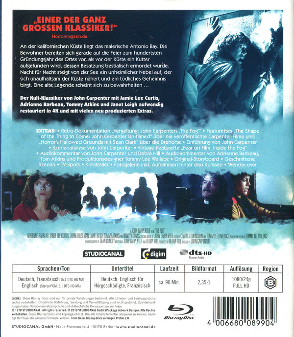 John Carpenters Horrorklassiker mit „Halloween“-Star Jamie Lee Curtis und „Psycho“-Hauptdarstellerin Janet Leigh: In Antonio Bay feiern die Bewohner den hundertsten Jahrestag der Ortsgründung, doch die Vergangenheit holt die Stadt wieder ein. Denn vor genau 100 Jahren tauchte hier etwas Böses aus dem Nebel auf und jetzt ist es zurückgekehrt. Fliehen Sie vor dem Nebel!Der US-amerikanische Regisseur, Drehbuchautor, Produzent, Schauspieler und Musikkomponist John Carpenter gilt bei vielen als Erfinder des neuzeitlichen Horrorfilms und ist einer der renommiertesten Regisseure, die das Horror- und Science-Fiction-Genre hervorgebracht hat. Er gewann mit seinem ersten Kurzfilm „The Resurrection of Bronco Billy“ direkt seinen ersten Oscar. Als schöpferischer Musikliebhaber komponierte er für fast all seine Filme den Soundtrack selbst. Drei Carpenter Kult-Filme erscheinen nun erstmals aufwendig in 4K restauriert inklusive neu produziertem umfangreichem Bonusmaterial, neben „The Fog“ auch „Sie leben“und „Die Fürsten der Dunkelheit“.