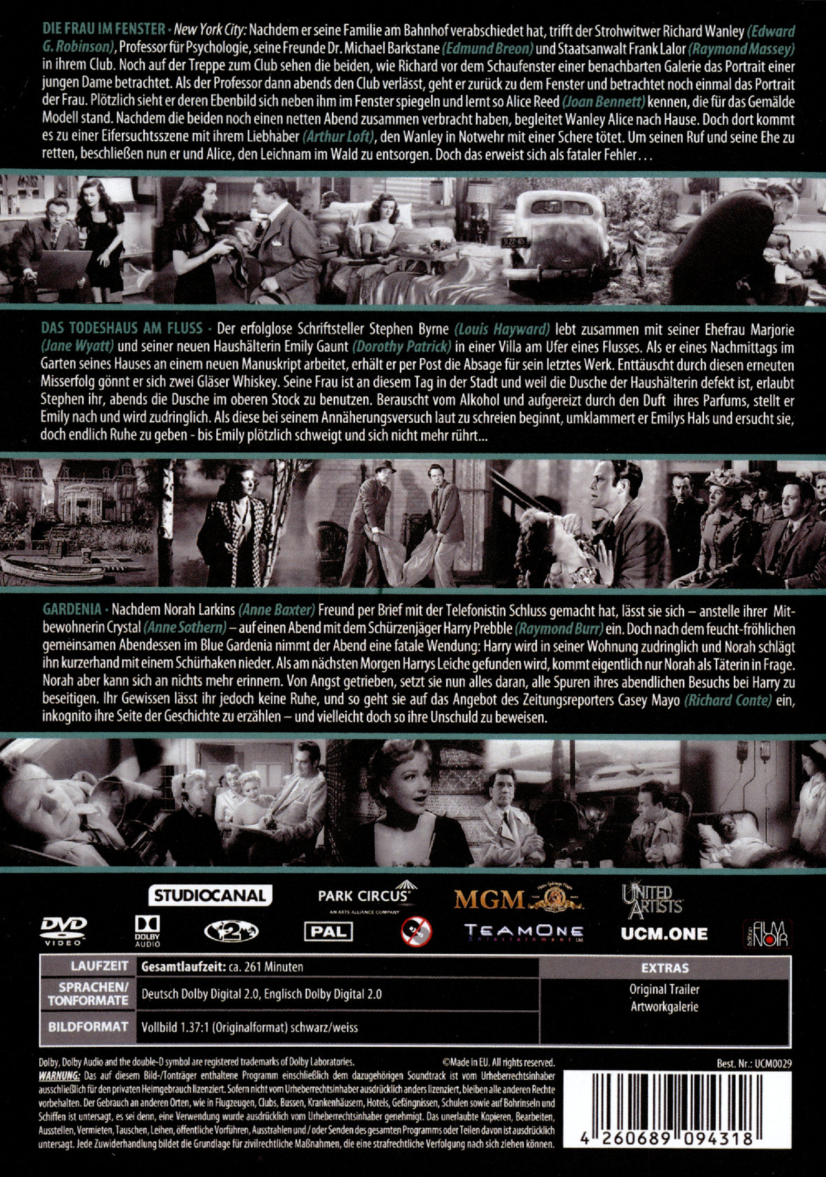 Die Frau im Fenster New York City: Nachdem er seine Familie am Bahnhof verabschiedet hat, trifft der Strohwitwer Richard Wanley (Edward G. Robinson), Professor für Psychologie, seine Freunde Dr. Michael Barkstane (Edmund Breon) und Staatsanwalt Frank Lalor (Raymond Massey) in ihrem Club. Noch auf der Treppe zum Club sehen die beiden, wie Richard vor dem Schaufenster einer benachbarten Galerie das Portrait einer jungen Dame betrachtet. In Folge dessen diskutieren die drei Freunde den Reiz und die Gefahr der steten Abenteuerlust von Männern im mittleren Alter. Als der Professor dann abends den Club verlässt, geht er zurück zu dem Fenster und betrachtet noch einmal das Portrait der Frau. Plötzlich sieht er deren Ebenbild sich neben ihm im Fenster spiegeln und lernt so Alice Reed (Joan Bennett) kennen, die für das Gemälde Modell stand. Nachdem die beiden noch einen netten Abend zusammen verbracht haben, begleitet Wanley Alice nach Hause. Doch dort kommt es zu einer Eifersuchtsszene mit ihrem Liebhaber (Arthur Loft), den Wanley in Notwehr mit einer Schere tötet. Um seinen Ruf und seine Ehe zu retten, beschließen nun er und Alice, den Leichnam im Wald zu entsorgen. Doch das erweist sich als fataler Fehler...