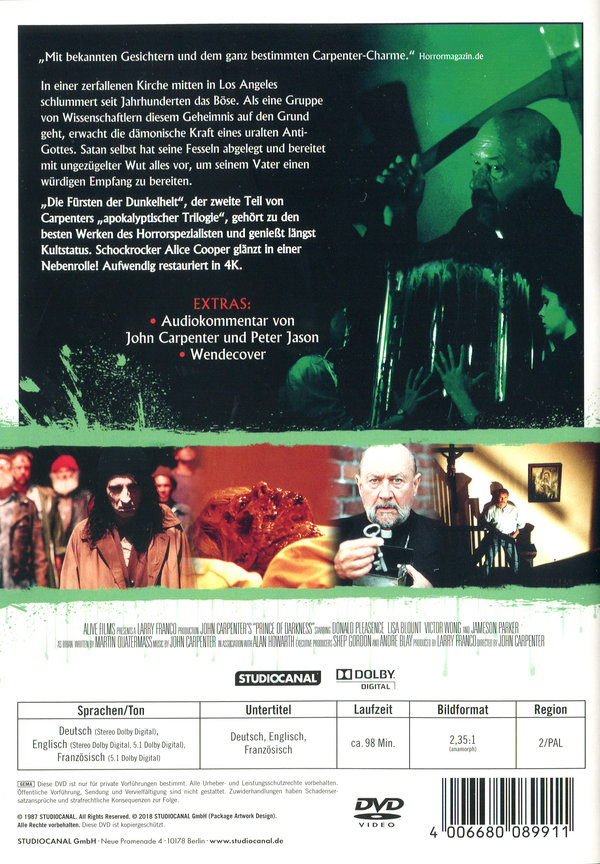 Der US-amerikanische Regisseur, Drehbuchautor, Produzent, Schauspieler und Musikkomponist John Carpenter gilt bei vielen als Erfinder des neuzeitlichen Horrorfilms und ist einer der renommiertesten Regisseure, die das Horror- und Science-Fiction-Genre hervorgebracht hat. Er gewann mit seinem ersten Kurzfilm „The Resurrection of Bronco Billy“ direkt seinen ersten Oscar. Als schöpferischer Musikliebhaber komponierte er für fast all seine Filme den Soundtrack selbst. Drei Carpenter Kult-Filme erscheinen nun erstmals aufwendig in 4K restauriert inklusive neu produziertem umfangreichem Bonusmaterial, neben „Die Fürsten der Dunkelheit“ auch „The Fog“ und „Sie leben“."Die Fürsten der Dunkelheit", der zweite Teil von Carpenters "apokalyptischer Trilogie", gehört zu den besten Werken des Horrorspezialisten und genießt längst Kultstatus. Schockrocker Alice Cooper glänzt in einer Nebenrolle!Plötzlich auftretende Veränderungen in der Umwelt und schreckliche Naturkatastrophen verheißen für all diejenigen, die die Zeichen deuten können, nichts Gutes: Die Wiederkehr Satans steht kurz bevor. In einer zerfallenen Kirche mitten in Los Angeles, gefangen in einem gläsernen Schrein, schlummert seit Jahrhunderten das Böse. Als Wissenschaftler diesem furchtbaren Geheimnis auf den Grund gehen wollen, erwacht die dämonische Kraft eines uralten Anti-Gottes. Mit Hilfe eines Priesters versuchen sie verzweifelt, dem Bösen zu trotzen. Doch alle Anstrengungen sind vergebens: Nach und nach werden alle Beteiligten zu Zombies. Satan hat seine Fesseln abgelegt und bereitet mit rasender Wut alles vor, um seinem Vater, dem Anti-Gott, einen würdigen Empfang zu bereiten ...