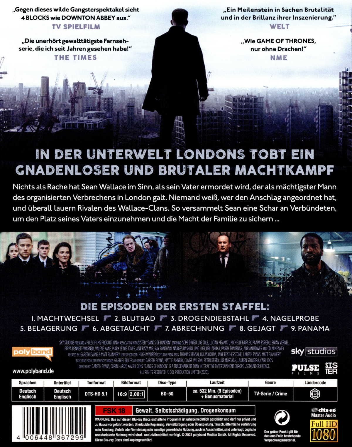 | Inhalt | Knallharte Crimeserie mit jeder Menge Action: In der Unterwelt Londons tobt ein gnadenloser und brutaler Machtkampf. Nichts als Rache hat Sean Wallace im Sinn, als sein Vater ermordet wird, der als mächtigster Mann des organisierten Verbrechens in London galt. Keiner weiß, wer hinter dem Mord steckt, und überall lauern Rivalen des Wallace-Clans. So versammelt Sean eine Schar an Verbündeten, um die Macht der Familie zu sichern. Die Episoden der ersten Staffel: 1. Machtwechsel 2. Blutbad 3. Drogendiebstahl 4. Nagelprobe 5. Belagerung 6. Abgetaucht 7. Abrechnung 8. Gejagt 9. Panama |
