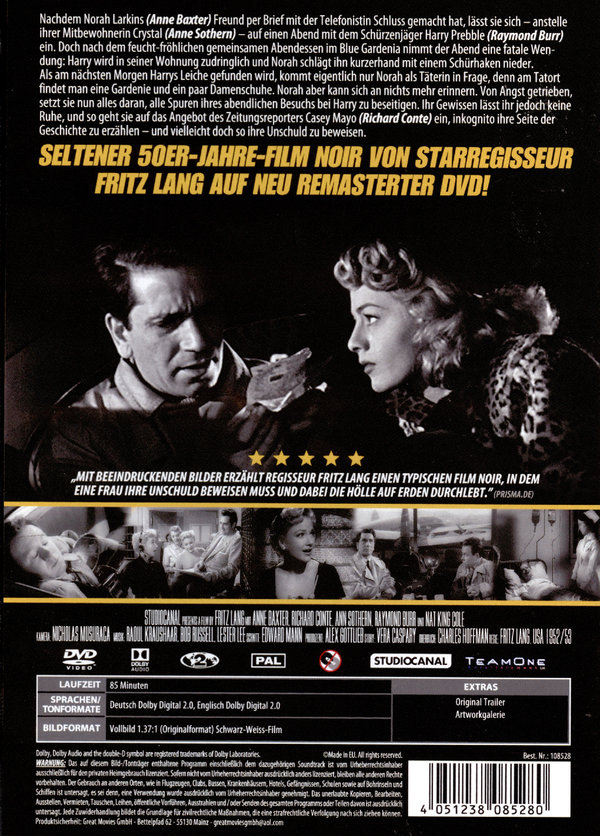 Nachdem Norah Larkins (Anne Baxter) Freund per Brief mit der Telefonistin Schluss gemacht hat, lässt sie sich - an Stelle ihrer Mitbewohnerin Crystal (Anne Sothern) - auf einen Abend mit dem Schürzenjäger Harry Prebble (Raymond Burr) ein. Doch nach dem feucht-fröhlichen gemeinsamen Abendessen im Blue Gardenia nimmt der Abend eine fatale Wendung: Harry wird in seiner Wohnung zudringlich und Norah schlägt ihn kurzerhand mit einem Schürhaken nieder. Als am nächsten Morgen Harrys Leiche gefunden wird, kommt eigentlich nur Norah als Täterin in Frage, denn am Tatort findet man eine Gardenie und ein paar Damenschuhe. Norah aber kann sich an nichts mehr erinnern. Von Angst getrieben, setzt sie nun alles daran, alle Spuren ihres abendlichen Besuchs bei Harry zu beseitigen. Ihr Gewissen lässt ihr jedoch keine Ruhe, und so geht sie auf das Angebot des Zeitungsreporters Casey Mayo (Richard Conte) ein, inkognito ihre Seite der Geschichte zu erzählen - und vielleicht doch so ihre Unschuld zu beweisen.