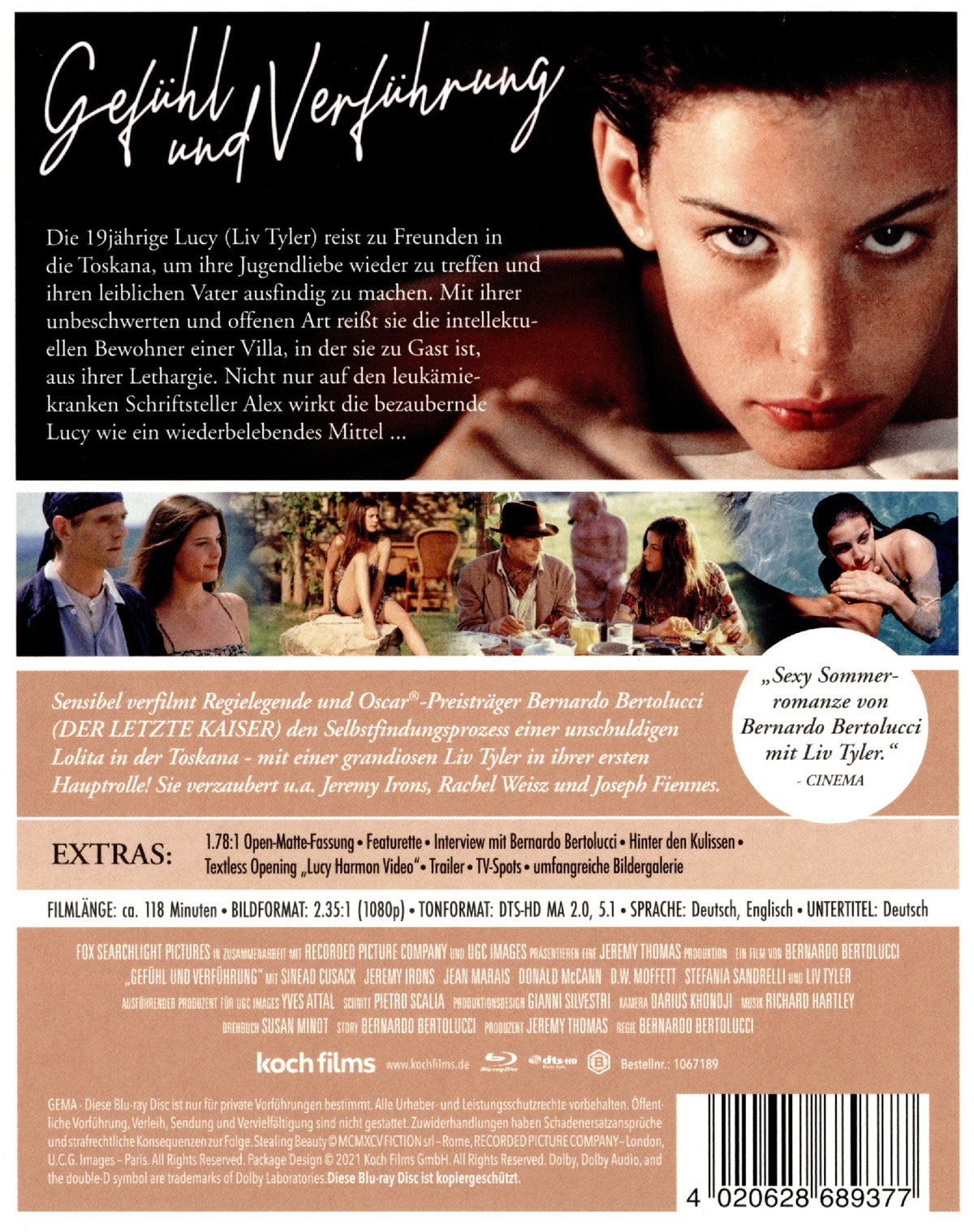 Sensibel verfilmt Regielegende und Oscar®-Preisträger Bernardo Bertolucci (DER LETZTE KAISER) den Selbstfindungsprozess einer unschuldigen Lolita in der Toskana - mit einer grandiosen Liv Tyler in ihrer ersten Hauptrolle! Sie verzaubert u.a. Jeremy Irons, Rachel Weisz und Joseph Fiennes.