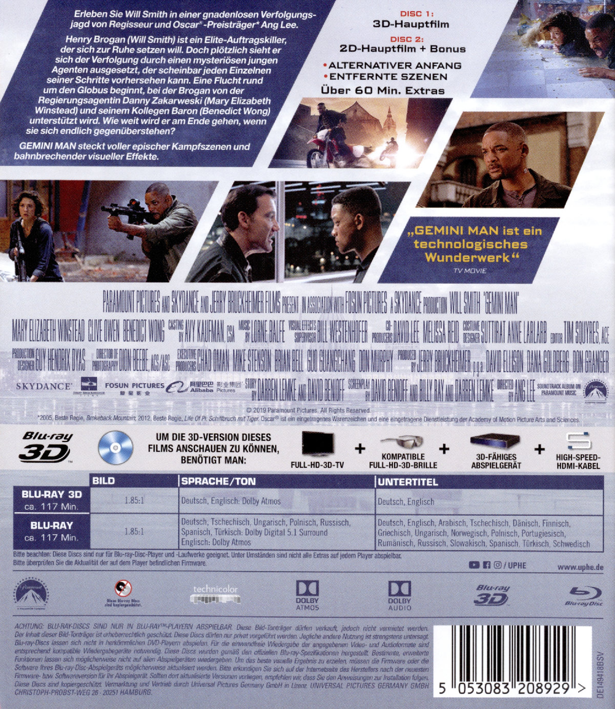 Erleben Sie Will Smith in einer gnadenlosen Verfolgungsjagd von Regisseur und Oscar®-Preisträger Ang Lee.Henry Brogan (Will Smith) ist ein Elite-Auftragskiller, der sich zur Ruhe setzen will. Doch plötzlich sieht er sich der Verfolgung durch einen mysteriösen jungen Agenten ausgesetzt, der scheinbar jeden Einzelnen seiner Schritte vorhersehen kann. Eine Flucht rund um den Globus beginnt, bei der Brogan von der Regierungsagentin Danny Zakarweski (Mary Elizabeth Winstead) und seinem Kollegen Baron (Benedict Wong) unterstützt wird. Wie weit wird er am Ende gehen, wenn sie sich endlich gegenüberstehen?"Gemini Man" steckt voller epischer Kampfszenen und bahnbrechender visueller Effekte."Gemini Man ist ein technologisches Wunderwerk" (TV Movie)