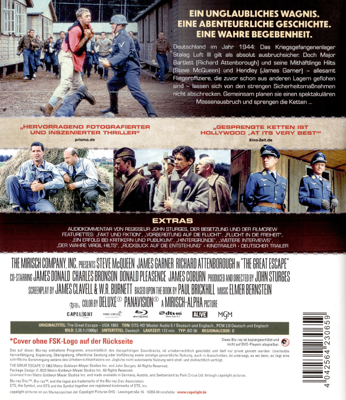 Audiokommentar von Regisseur John Sturges; der Besetzung und der Filmcrew; Featurettes: "Fakt und Fiktion"; "Vorbereitung auf die Flucht"; "Flucht in die Freiheit"; "Ein Erfolg bei Kritikern und Publikum"; "Hintergründe"; "Weitere Interviews"; "Der wahre Virgil Hilts"; "Rückblick auf die Entstehung"; Kinotrailer; Deutscher Trailer