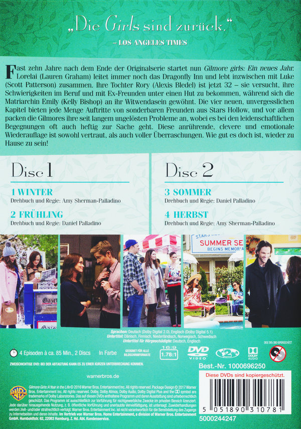 Fast zehn Jahre nach dem Ende der Originalserie startet nun Gilmore Girls: Ein neues Jahr: Lorelai (Lauren Graham) leitet immer noch das Dragonfly Inn und lebt inzwischen mit Luke (Scott Patterson) zusammen. Ihre Tochter Rory (Alexis Bledel) ist jetzt 32 - sie versucht ihre Schwierigkeiten im Beruf und mit Ex-Freunden unter einen Hut zu bekommen, während sich die Matriarchin Emily (Kelly Bishop) an ihr Witwendasein gewöhnt. Die vier neuen, unvergesslichen Kapitel bieten jede Menge Auftritte von sonderbaren Freunden aus Stars Hollow, und vor allem packen die Gilmores ihre seit langem ungelösten Probleme an, wobei es bei den leidenschaftlichen Begegnungen oft auch heftig zur Sache geht. Diese anrührende, clevere und emotionale Wiederauflage ist sowohl vertraut, als auch voller Überraschungen. Wie gut es doch ist, wieder zu Hause zu sein!