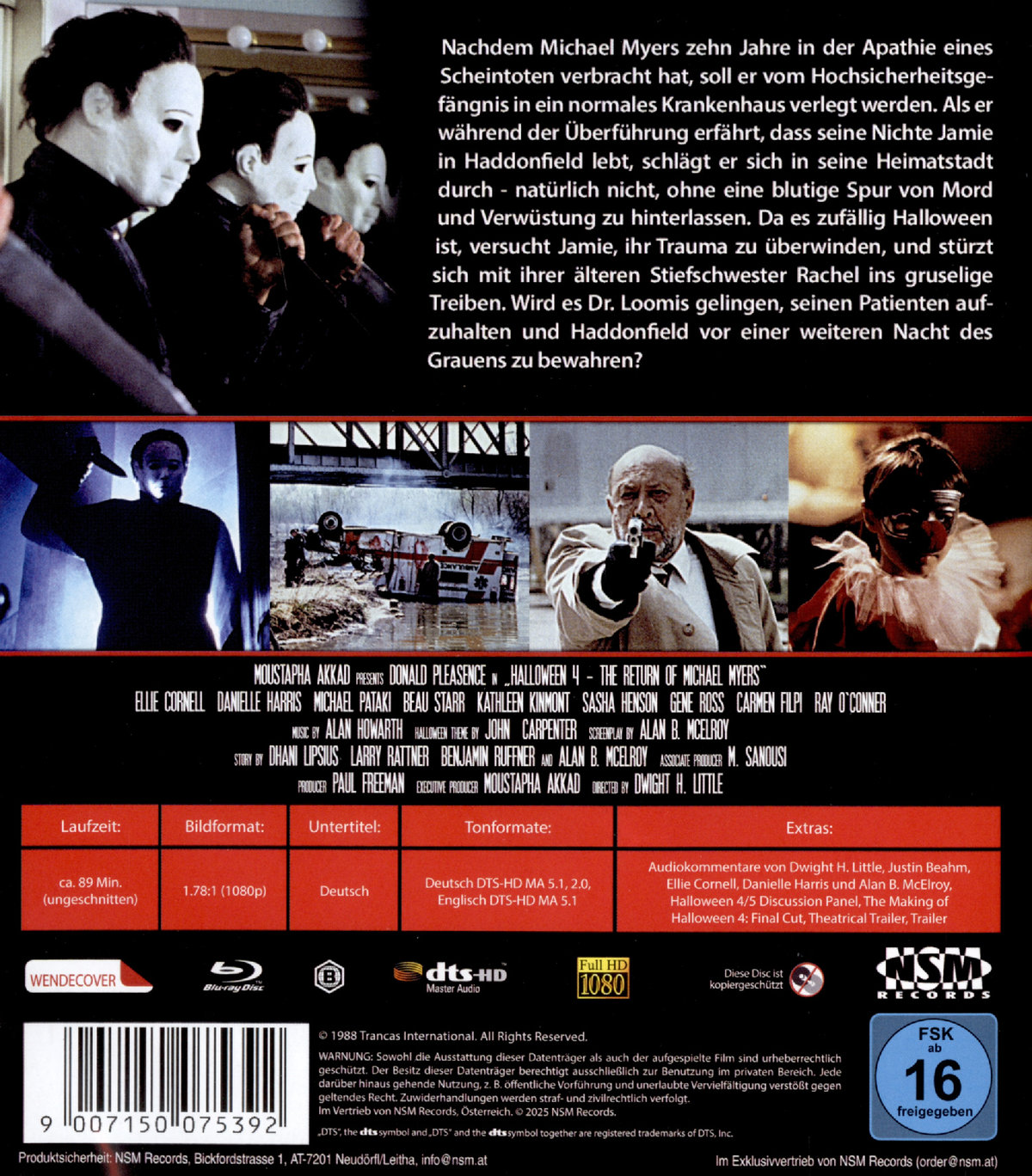Audiokommentar mit Regisseur Dwight H. Little und Autor Justin Beahm; Audiokommentar mit den Schauspielern Ellie Cornell und Danielle Harris; Audiokommentar mit Alan B. McElroy. Halloween 4 / 5 Discussion Panel; Theatrical Trailer; Trailer Halloween 3-5