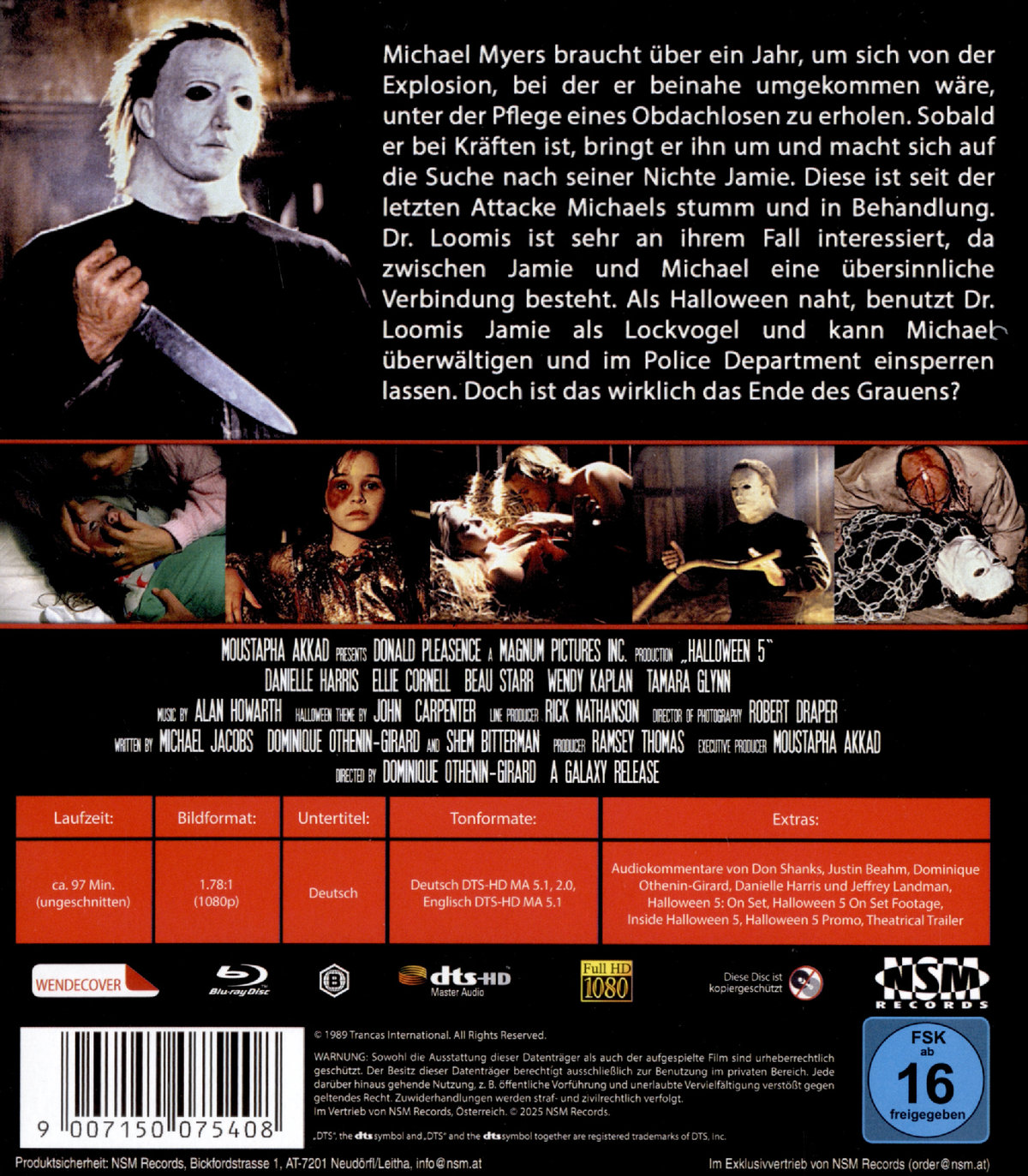 Audiokommentar mit Schauspieler Don Shanks und Autor Justin Beahm; Audiokommentar mit Regisseur Dominique Othenin-Girard und den Schauspielern Danielle Harris und Jeffrey Landman; Halloween 5: On Set; Halloween 5 On Set Footage; Inside Halloween 5; Halloween 5 Promo; Theatrical Trailer