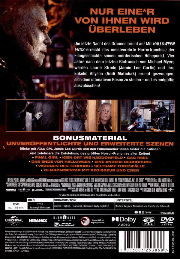 Im nervenzerreißenden Abschluss der legendäre Horror-Kultfilmreihe aller Zeiten tritt Laurie Strode (Jamie Lee Curtis) ein letztes Mal dem menschgewordenen Bösen Michael Myers gegenüber.Nach den Ereignissen in "Halloween Kills" war Michael vier Jahre lang abgetaucht. Laurie hat ihre Enkelin Allyson (Andi Matichak) aufgenommen und sich entschlossen, Angst und Wut hinter sich zu lassen und das Leben zu genießen.Doch als ein junger Mann beschuldigt wird, beim Babysitting einen kleinen Jungen ermordet zu haben, wird eine Kaskade aus Gewalt und Terror entfesselt. Es kommt zu einer tödlichen Konfrontation zwischen Laurie und Michael, wie sie das Kino noch nie zuvor gesehen hat.