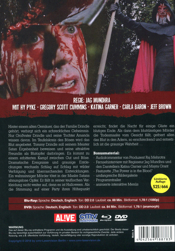 Auf 666 Stück limitiertes Mediabook; Umfangreiches Booklet von Christoph N. Kellerbach; Audiokommentar von Produzent Raj Mehrotra;Fernsehinterview mit Regisseur Jag Mundhra und den Darstellern Katina Garner und Mayra Grant; Featurette "The Power is in the Blood"; Umfangreiche Bildergalerie;Programmtrailer;Animierte interaktive Menüs;DVD-Version: DD 2.0: Deutsch, Englisch - 1,78:1 (16:9);