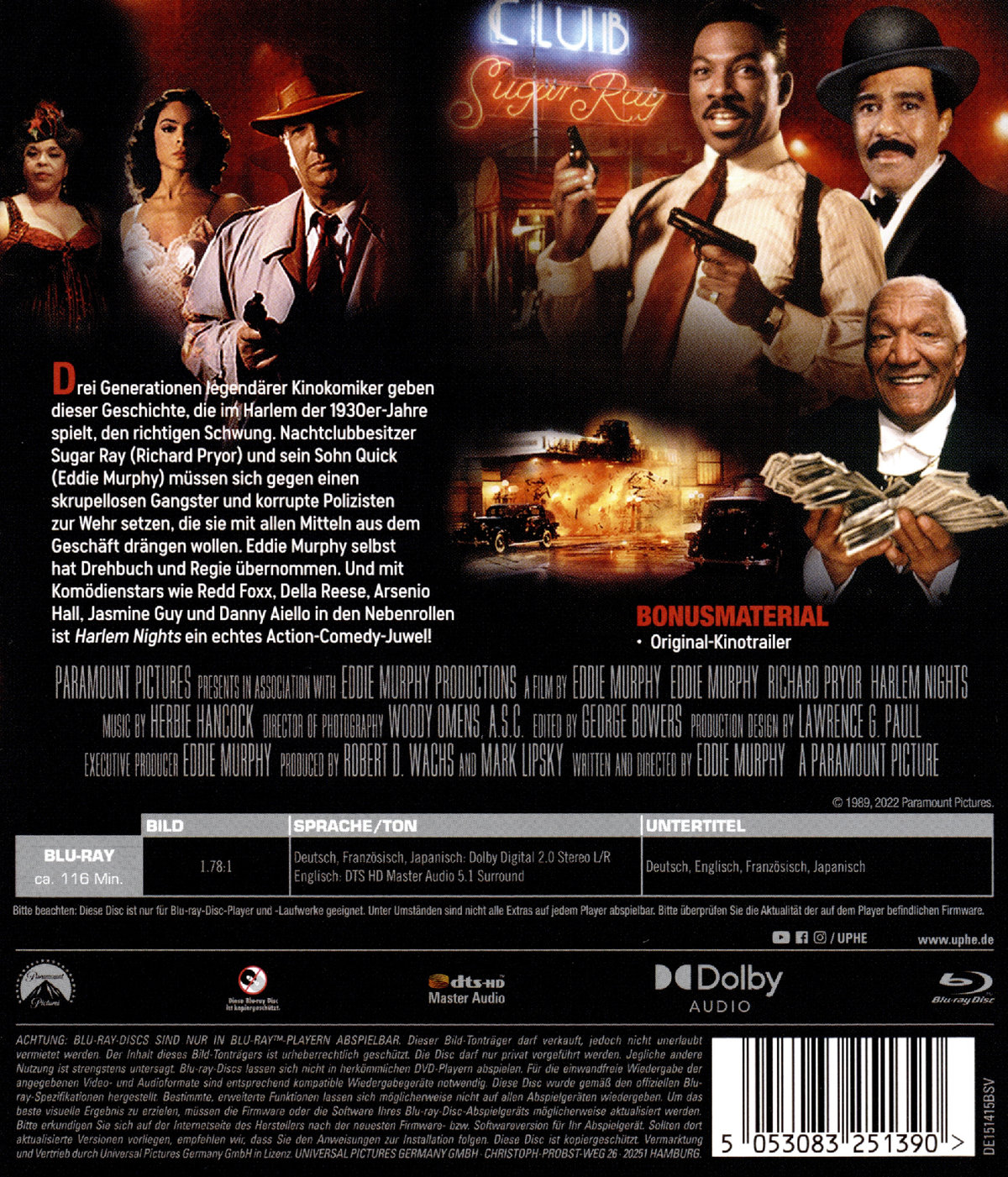 Drei Generationen legendärer Kinokomiker geben dieser Geschichte, die im Harlem der 1930er-Jahre spielt, den richtigen Schwung.Nachtclubbesitzer Sugar Ray (Richard Pryor) und sein Sohn Quick (Eddie Murphy) müssen sich gegen einen skrupellosen Gangster und korrupte Polizisten zur Wehr setzen, die sie mit allen Mitteln aus dem Geschäft drängen wollen.Eddie Murphy selbst hat Drehbuch und Regie übernommen. Und mit Komödienstars wie Redd Foxx, Della Reese, Arsenio Hall, Jasmine Guy und Danny Aiello in den Nebenrollen ist "Harlem Nights" ein echtes Action-Comedy-Juwel!