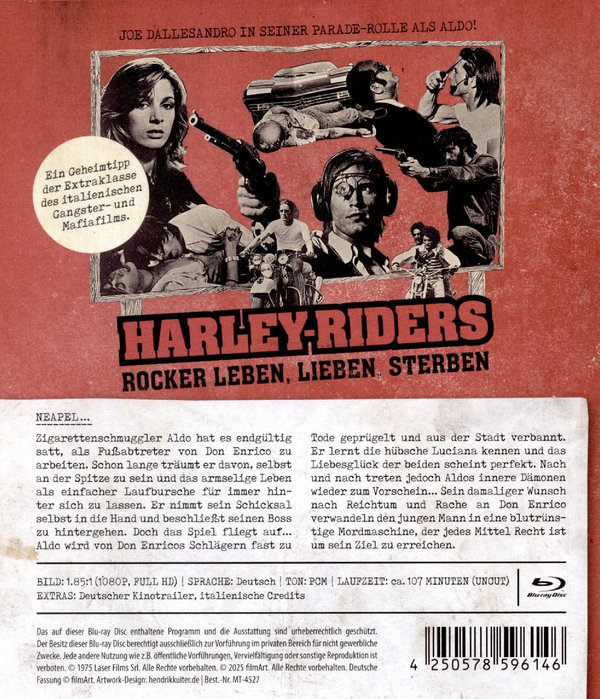Neapel... Zigarettenschmuggler Aldo hat es endgültig satt, als Fußabtreter von Don Enrico zu arbeiten. Schon lange träumt er davon, selbst an der Spitze zu sein und das armselige Leben als einfacher Laufbursche für immer hinter sich zu lassen. Er nimmt sein Schicksal selbst in die Hand und beschließt, seinen Boss zu hintergehen. Doch das Spiel fliegt auf...Aldo wird von Don Enricos Schlägern fast zu Tode geprügelt und aus der Stadt verbannt. Er lernt die hübsche Luciana kennen und das Liebesglück der beiden scheint perfekt. Nach und nach treten jedoch Aldos innere Dämonen wieder zum Vorschein... Sein damaliger Wunsch nach Reichtum und Rache an Don Enrico verwandeln den jungen Mann in eine blutrünstige Mordmaschine, der jedes Mittel Recht ist, um sein Ziel zu erreichen. Joe Dallesandro (DIE WILDE MEUTE; DIE GRAUSAMEN DREI) erneut in der Rolle, die er am besten kann! Er ist Aldo! Eine Bestie in Menschengestalt, die seine psychotischen Gedanken wahr werden lässt. HARLEY RIDERS – SIE KANNTEN KEIN ERBARMEN ist eine seltene Perle des italienischen Gangster-und Mafiafilms... bis heute noch völlig unterschätzt!