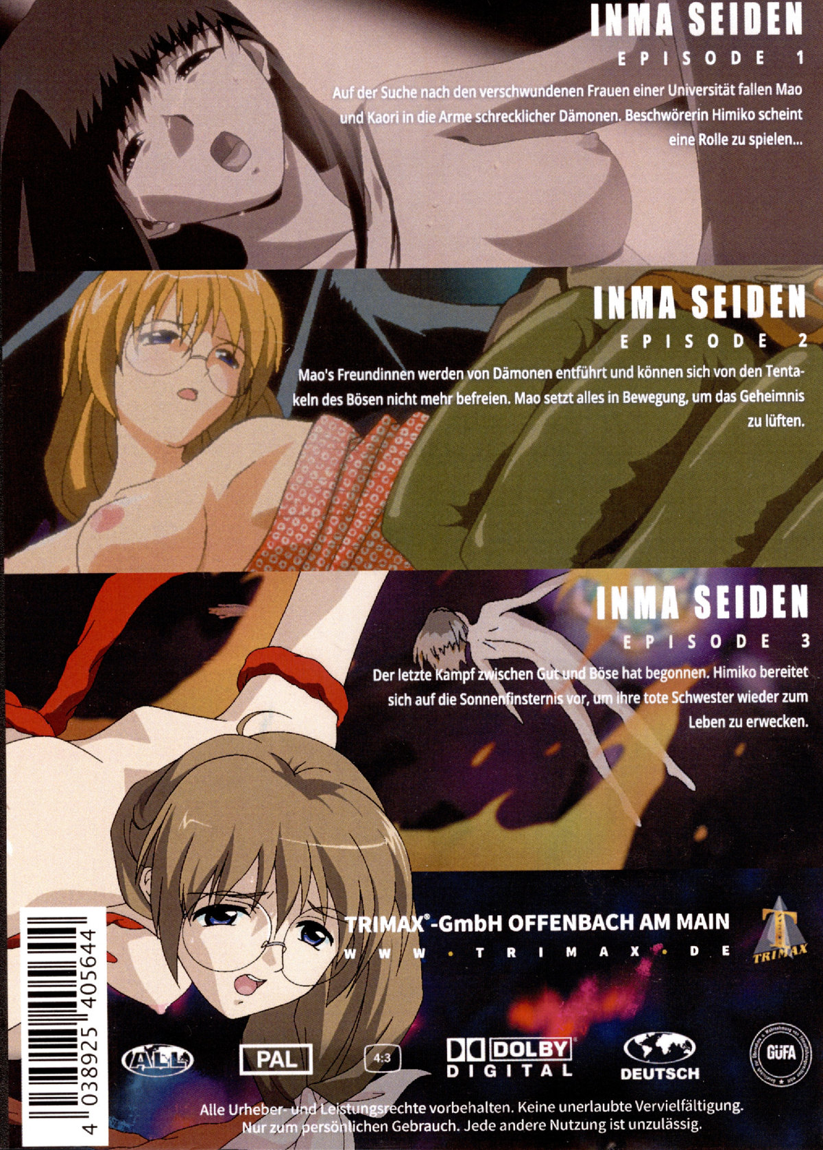 Inma Seiden 1 Auf der Suche nach den verschwundenen Frauen einer Universität fallen Mao und Kaori in die Arme schrecklicher Dämonen. Beschwörerin Himiko scheint eine Rolle zu spielen… Inma Seiden 2 Mao's Freundinnen werden von Dämonen entführt und können sich von den Tentakeln des Bösen nicht mehr befreien. Mao setzt alles in Bewegung, um das Geheimnis zu lüften. Inma Seiden 3 Der letzte Kampf zwischen Gut und Böse hat begonnen. Himiko bereitet sich auf die Sonnenfinsternis vor, um ihre tote Schwester wieder zum Leben zu erwecken.
