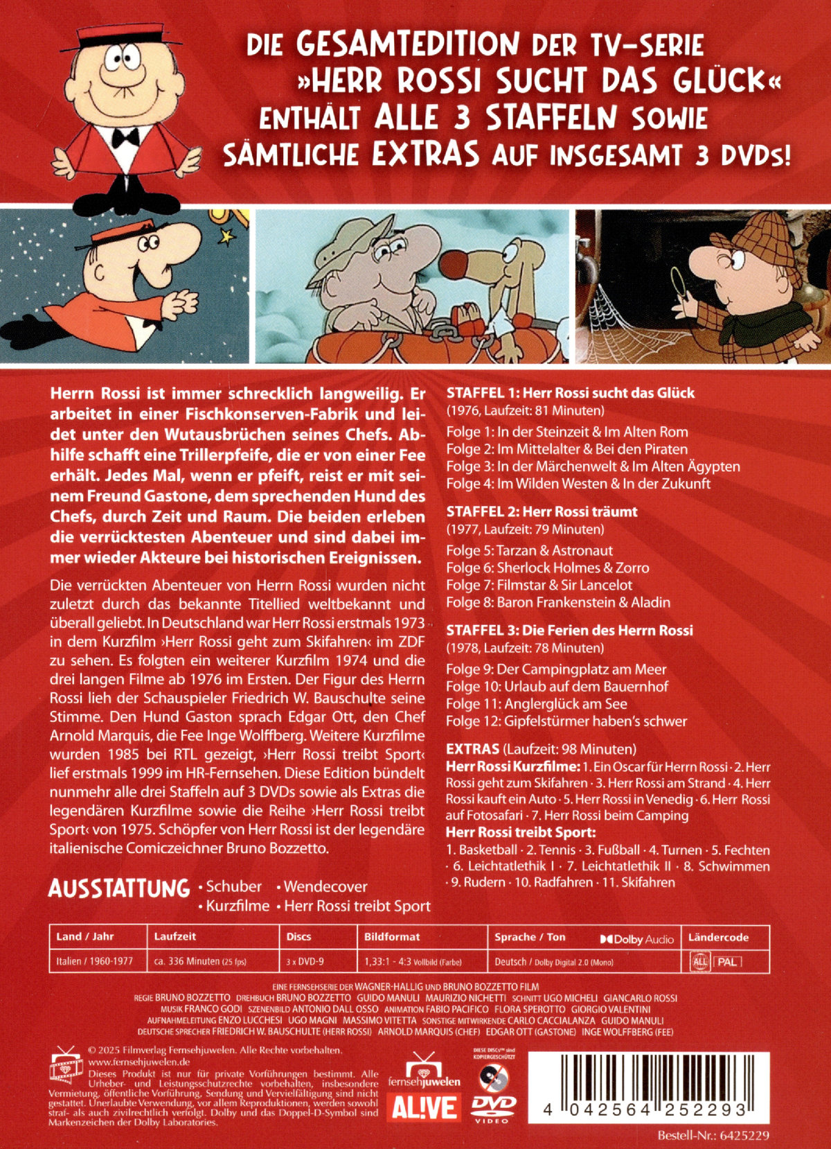 Herrn Rossi ist immer schrecklich langweilig. Er arbeitet in einer Fischkonserven-Fabrik und leidet unter den Wutausbrüchen seines Chefs. Abhilfe schafft eine Trillerpfeife, die er von einer Fee erhält. Jedes Mal, wenn er pfeift, reist er mit seinem Freund Gastone, dem sprechenden Hund des Chefs, durch Zeit und Raum. Die beiden erleben die verrücktesten Abenteuer und sind dabei immer wieder Akteure bei historischen Ereignissen. Die verrückten Abenteuer von Herrn Rossi wurden nicht zuletzt durch das bekannte Titellied weltbekannt und überall geliebt. In Deutschland war Herr Rossi erstmals 1973 in dem Kurzfilm Herr Rossi geht zum Skifahren im ZDF zu sehen. Es folgten ein weiterer Kurzfilm 1974 und die drei langen Filme ab 1976 im Ersten. Der Figur des Herrn Rossi lieh der Schauspieler Friedrich W. Bauschulte seine Stimme. Den Hund Gaston sprach Edgar Ott, den Chef Arnold Marquis, die Fee Inge Wolffberg. Weitere Kurzfilme wurden 1985 bei RTL gezeigt, "Herr Rossi treibt Sport" lief erstmals 1999 im HR-Fernsehen. Diese Edition bündelt nunmehr alle drei Staffeln auf 3 DVDs sowie als Extras alle Kurzfilme, Musikvideos, Interview-Sequenzen sowie "Herr Rossi treibt Sport" von 1975. Friedrich W. Bauschulte war die deutsche Stimme von Herrn Rossi, Edgar Ott die von Gastone.