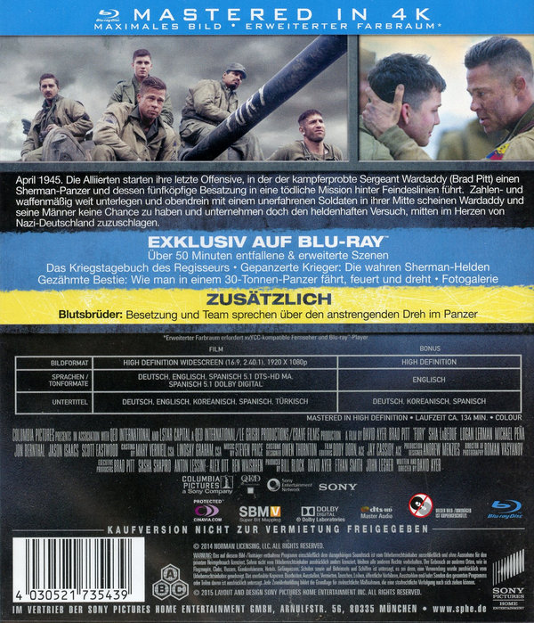 April, 1945. Während die Alliierten ihren letzten und entscheidenden Vorstoß in den Kriegsschauplatz von Europa wagen, kommandiert ein kampferprobter Army Sergeant namens Wardaddy einen Sherman Panzer und dessen fünfköpfige Besatzung auf einer tödlichen Mission hinter den Feindeslinien. Zahlen- und waffenmäßig weit unterlegen, müssen sich Wardaddy und seine Männer gegen überwältigend große Widerstände behaupten, während sie versuchen, mitten im Herzen von Nazi-Deutschland zuzuschlagen.