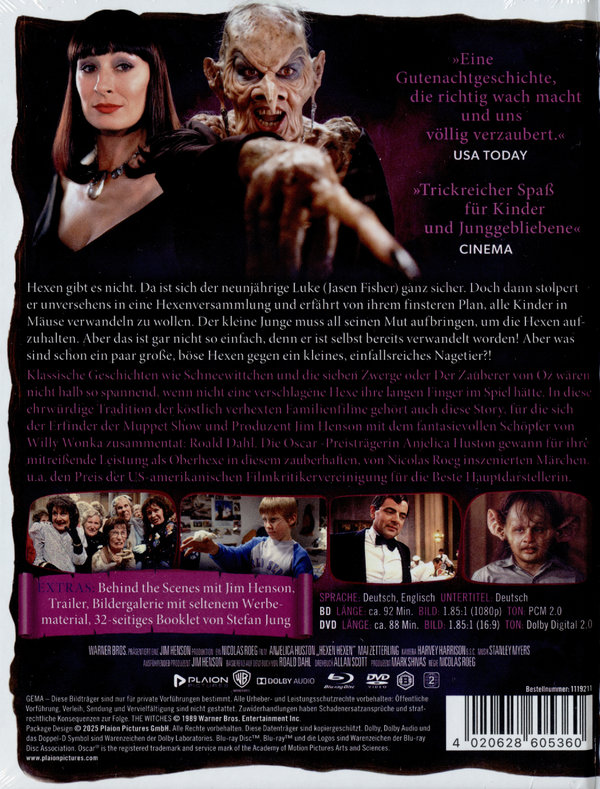 Hexen gibt es nicht. Da ist sich der neunjährige Luke (Jasen Fisher) ganz sicher. Doch dann stolpert er unversehens in eine Hexenversammlung und erfährt von ihrem finsteren Plan, alle Kinder in Mäuse verwandeln zu wollen. Der kleine Junge muss all seinen Mut aufbringen, um die Hexen aufzuhalten. Aber das ist gar nicht so einfach, denn er ist selbst bereits verwandelt worden! Aber was sind schon ein paar große, böse Hexen gegen ein kleines, einfallsreiches Nagetier?! Märchenklassiker wie Schneewittchen und die sieben Zwerge oder Der Zauberer von Oz wären nicht halb so spannend, hätte nicht eine hinterhältige Hexe ihre langen Finger im Spiel. In dieser ehrwürdigen Tradition herrlich verhexter Familienfilme steht auch diese Geschichte, für die sich Muppet-Mastermind Jim Henson mit dem Schöpfer von Willy Wonka zusammengetan hat: Roald Dahl. Oscar®-Preisträgerin Anjelica Huston gewann für ihre mitreißende Darstellung der Oberhexe in diesem zauberhaften Märchen unter der Regie von Nicolas Roeg unter anderem den Preis der amerikanischen Filmkritikervereinigung für die beste Hauptdarstellerin.