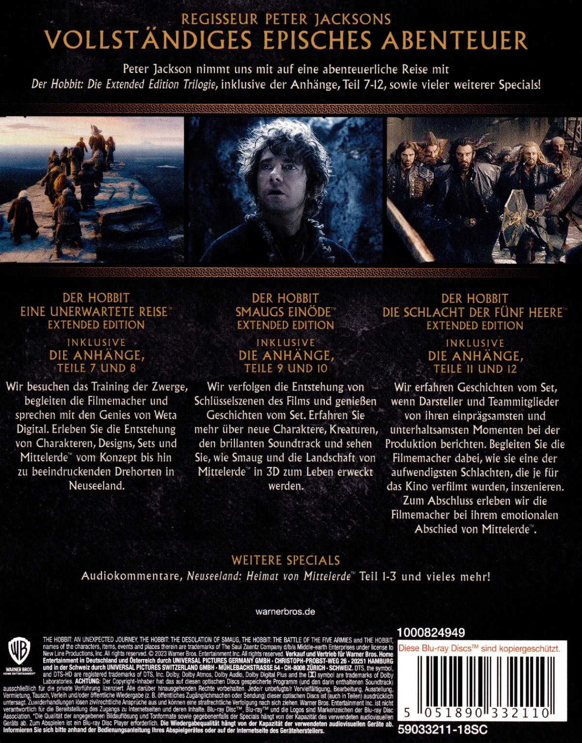 Erleben Sie Regisseur Peter Jacksons komplettes episches AbenteuerAlle drei Filme der "Hobbit"-Trilogie. Peter Jackson reist zurück nach Middle Earth mit einem neuen Abenteuer von Bilbo Baggins, der in das legendäre Abenteuer verwickelt wird, das verlorene Zwergenreich Erebor von dem schrecklichen Drachen Smaug zurückzuerobern. Bilbo und seine Begleiter, dreizehn Zwerge und Gandalf, treffen auf Trolle, Orks, Kobolde, Elfen und den geheimnisvollen Gollum.