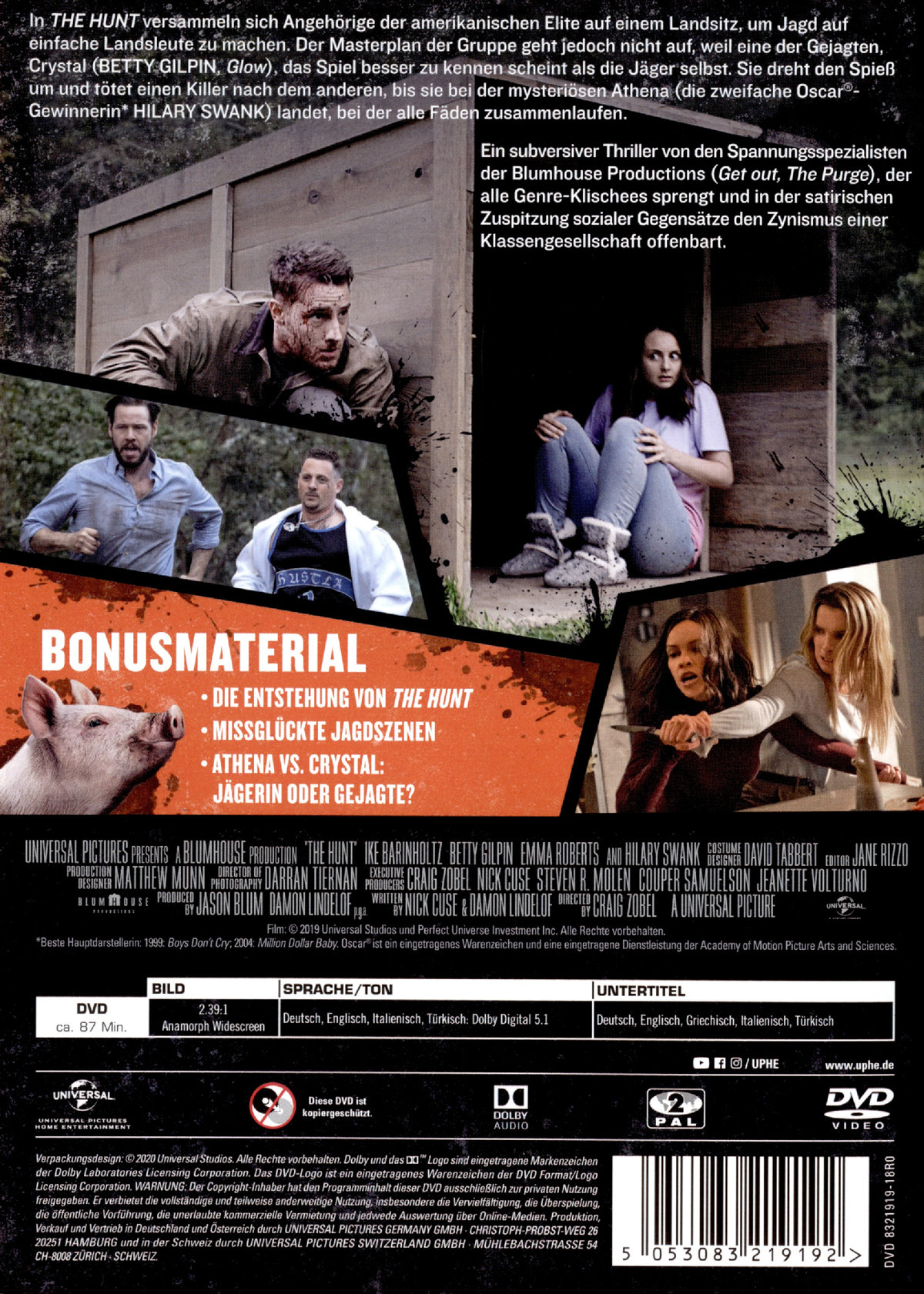 Nur ausgewählte Menschen sind zur Jagd freigegeben.In "The Hunt" versammeln sich Angehörige der amerikanischen Elite auf einem Landsitz, um Jagd auf einfache Landsleute zu machen. Der Masterplan der Gruppe geht jedoch nicht auf, weil eine der Gejagten, Crystal (Betty Gilpin, "Glow"), das Spiel besser zu kennen scheint als die Jäger selbst. Sie dreht den Spieß um und tötet einen Killer nach dem anderen, bis sie bei der mysteriösen Athena (die zweifache Oscar®-Gewinnerin Hilary Swank) landet, bei der alle Fäden zusammenlaufen.Ein subversiver Thriller von den Spannungsspezialisten der Blumhouse Productions ("Get out", "The Purge"), der alle Genre-Klischees sprengt und in der satirischen Zuspitzung sozialer Gegensätze den Zynismus einer Klassengesellschaft offenbart.