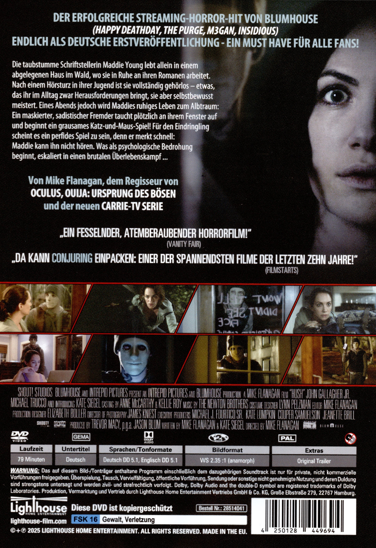 Die taubstumme Autorin Maddie lebt isoliert im Wald, wo sie in Ruhe an ihren Romanen arbeitet - bis plötzlich ein maskierter Fremder auftaucht. Er beobachtet sie, spielt mit ihr. Denn er weiß: Sie kann ihn nicht hören. Aus stiller Bedrohung wird blanker Horror! Eingesperrt, ohne Hilfe - und der Killer beginnt sein grausames Katz-und-Maus-Spiel …
