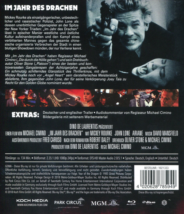 Mit "Im Jahr des Drachen" haben Regisseur Michael Cimino ("Die durch die Hölle gehen") und sein Drehbuchautor Oliver Stone ("Platoon") eines der besten und kontroversesten Gangsterepen der Achtziger Jahre geschaffen: Ein schmutzig schillerndes Glanzstück des Thrillerkinos, mit dem Mickey Rourke noch vor "Angel Heart" sein darstellerisches Meisterstück ablieferte, ihm gegenüber John Lone, der für seine Verkörperung Joey Tais zu Recht für den Golden Globe nominiert wurde.