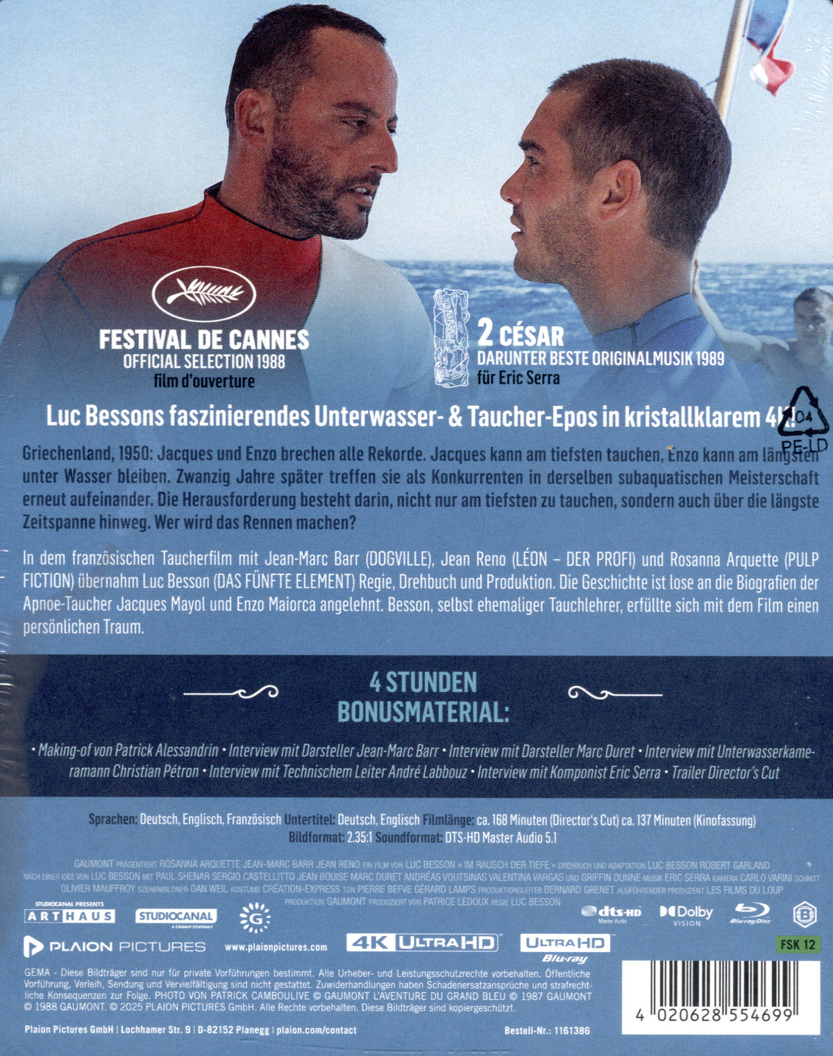 In dem französischen Taucherfilm von 1988, bei dem sich Luc Besson (DAS FÜNFTE ELEMENT) für Regie, Drehbuch und Produktion verantwortlich zeichnete, übernahmen Jean-Marc Barr (DOGVILLE) und Jean Reno (LÉON – DER PROFI) die Hauptrollen. Rosanna Arquette (PULP FICTION) ist in einer Nebenrolle zu sehen. Die fiktionale Geschichte ist lose an die Biografien der Apnoe-Taucher Jacques Mayol und Enzo Maiorca angelehnt. Besson, der früher selbst als Tauchlehrer tätig war und einen kurzen Cameo-Auftritt als Taucher hat, erfüllte sich mit dem Film einen persönlichen Traum. Das Unterwasser-Epos wurde mit 2 Césars ausgezeichnet.
