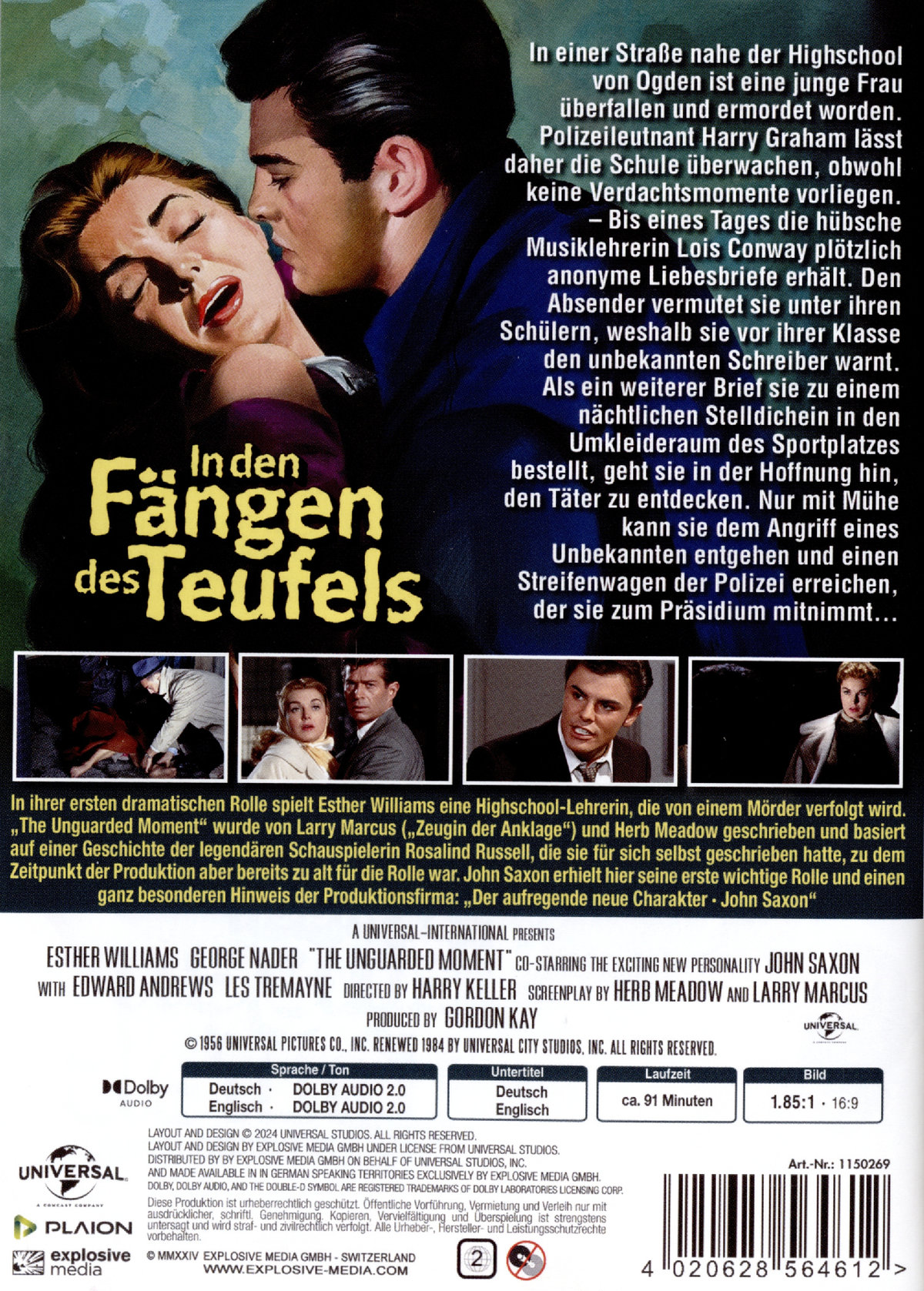 In einer seltenen dramatischen Rolle spielt Esther Williams eine Highschool-Lehrerin, die von einem Spanner verfolgt wird, bei dem es sich möglicherweise um denselben mörderischen Sexsüchtigen handelt, den die Polizei sucht. The IN DEN FÄNGEN DES TEUFELS wurde von Larry Marcus („Zeugin der Anklage“) und Herb Meadow („Lone Ranger“) zusammen mit der legendären Schauspielerin Rosalind Russell („Sein Mädchen für besondere Fälle“) geschrieben und ist ein stimmungsvoller Neo-Noir in Technicolor, in dem John Saxon („Der Mann mit der Todeskralle“) in einer seiner ersten großen Rollen und „Jerry Cotton“ George Nader („Das Haus der 1000 Puppen“) als ermittelnder Detektiv mitspielen. Regie führte Harry Keller.