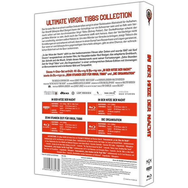 Der brutale Mord an einem weißen Industriellen sorgt in einer Südstaaten-Kleinstadt für Aufsehen. Für Sheriff Gillespie (Rod Steiger) kann der Schuldige nur ein Schwarzer sein und so fällt sein Verdacht sofort auf den durchreisenden Virgil Tibbs (Sidney Poitier). Der Dunkelhäutige scheint der perfekte Mörder zu sein, doch nach der Festnahme stellt sich heraus, dass der Verdächtige nicht nur unschuldig, sondern selbst Polizist ist. Um den Mörder zur Strecke zu bringen, steigt Tibbs in die Ermittlungen ein und erkennt schnell, dass er in einen Sumpf aus Rassenhass und Lügen geraten ist. Nur wenn er und Gillespie ihre gegenseitigen Vorurteile ablegen, gibt es eine Chance, der schrecklichen Wahrheit auf die Spur zu kommen. „In der Hitze der Nacht“ zählt zu den bedeutsamsten Filmen aller Zeiten und wurde 1967 mit fünf Oscars® ausgezeichnet: als bester Film, für Hauptdarsteller Rod Steiger, das adaptierte Drehbuch, den Schnitt und die Musik. Erlebt dieses Meisterwerk samt seiner Fortsetzungen „Zehn Stunden Zeit für Virgil Tibbs“ und „Die Organisation“ in einer umfangreichen Deluxe-Edition mit Unmengen an Bonusmaterial und in brillanter Bild und Tonqualität. 4K-Disc Sprachen: Deutsch, Englisch Untertiteln: Deutsch, Englisch Tonformate: DTS-HD Master Audio 2.0 / 5.1 Bildformate: 1.85:1 (2160p, HDR, Dolby Vision Blu-rays: Sprachen: Deutsch, Englisch Untertiteln: Deutsch, Englisch Tonformate: DTS-HD Master Audio 2.0 / 5.1* Bildformate: 1.85:1 (1080p) *nur „In der Hitze der Nacht“ Dieses 4-Disc-Set enthält: 4K-Blu-ray & Blu-ray von „IN DER HITZE DER NACHT“ sowie die Blu-rays zu „ZEHN STUNDEN ZEIT FÜR VIRGIL TIBBS“ und „DIE ORGANISATION“