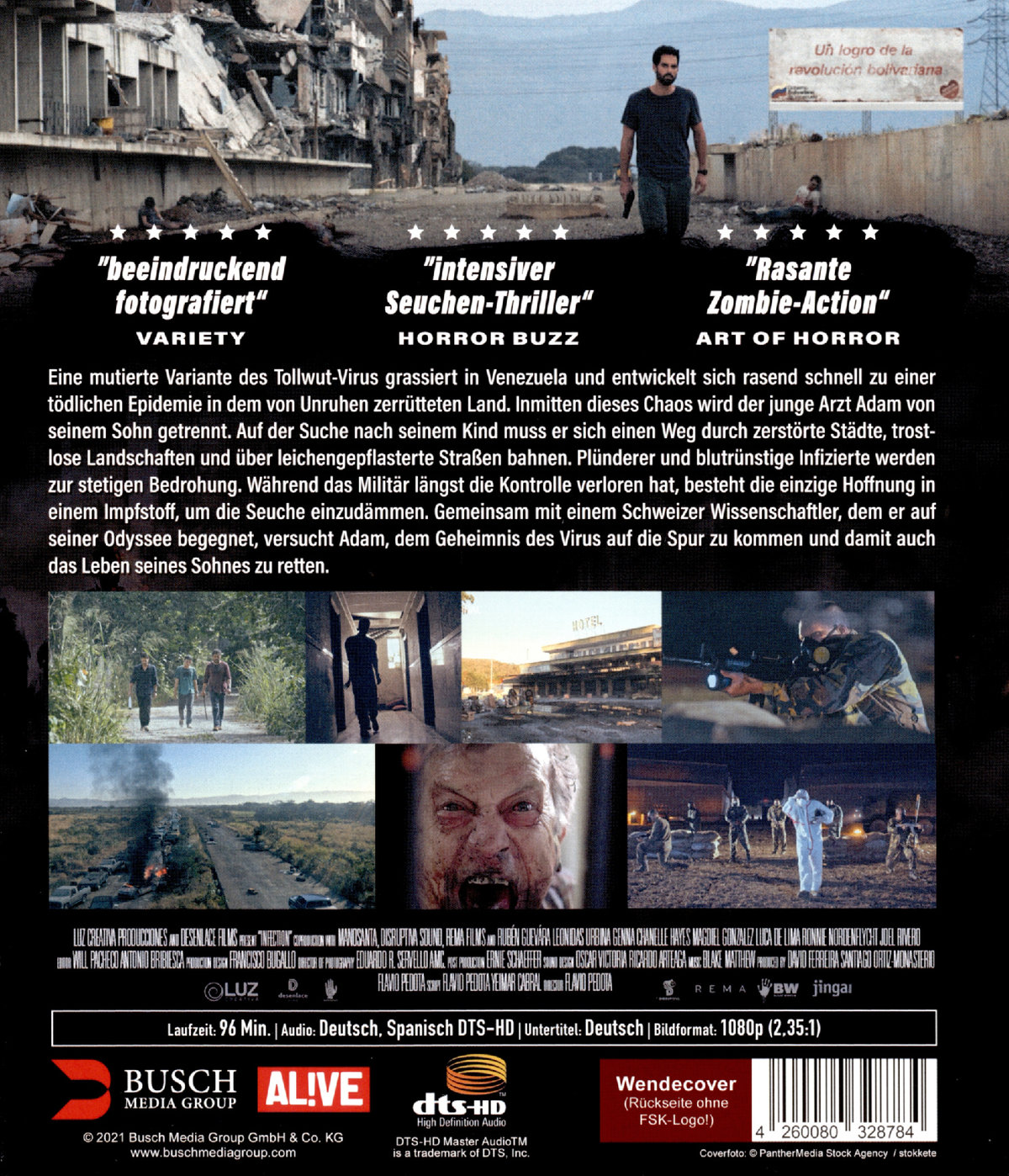Eine mutierte Variante des Tollwut-Virus grassiert in Venezuela und entwickelt sich rasend schnell zu einer tödlichen Epidemie in dem von Unruhen zerrütteten Land. Infection erzählt die Geschichte des jungen Arztes Adam, der inmitten dieses Chaos von seinem Sohn getrennt wird. Auf der Suche nach seinem Kind muss sich der Vater seinen Weg durch zerstörte Städte, trostlose Landschaften und über leichengepflasterte Straßen bahnen. Plünderer und blutrünstige Infizierte werden zur stetigen Bedrohung. Während das Militär längst die Kontrolle verloren hat, besteht die einzige Hoffnung für das Überleben aller in einem Impfstoff, um die Seuche einzudämmen. Gemeinsam mit einem Schweizer Wissenschaftler, dem er auf seiner Odyssee begegnet, versucht Adam, dem Geheimnis des Virus auf die Spur zu kommen und damit auch das Leben seines Sohnes zu retten. Ein Wettlauf gegen die Zeit beginnt. Infection ist ein spektakulärer Seuchen-Horror-Thriller und eine Allegorie auf die sozialen und politischen Missstände in Venezuela. Auf diese Weise übt der Film versteckte Kritik am Maduro-Regime. Die Reaktion der Machthaber ließ nicht lange auf sich warten: Infection wurde in seinem Herkunftsland verboten. Infection ist aufwändig inszeniert und wurde unter äußerst widrigen Produktionsbedingungen an über 60 Locations in Venezuela gedreht. Aufgrund der unsicheren Lage mussten die Filmsets ständig von der Polizei geschützt werden. Die Grundidee des Films wurde während der Dreharbeiten von der bitteren Realität eingeholt, als sich zeitgleich das heimtückische Zika-Virus in Südamerika zu einer gefährlichen Epidemie ausbreitete.