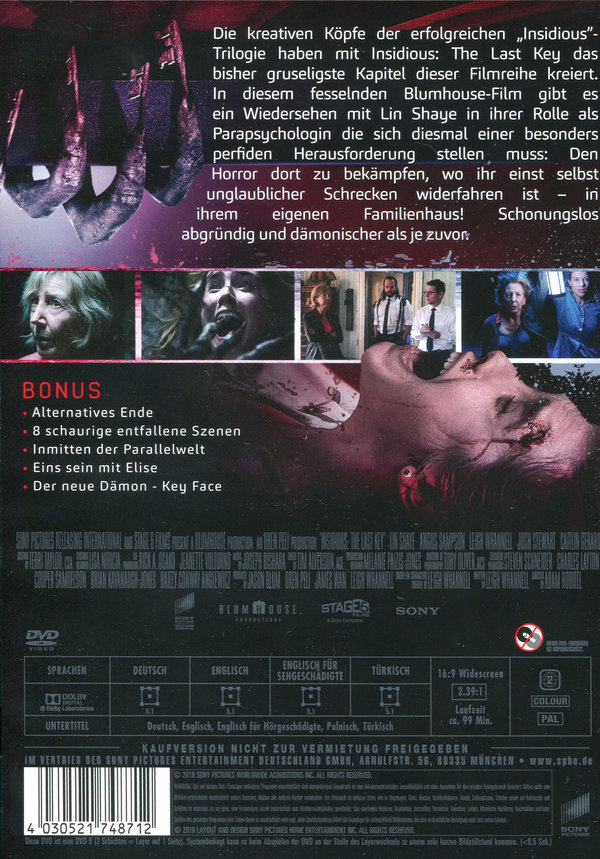 Die kreativen Köpfe der erfolgreichen „Insidious"-Triologie haben mit Insidious: The Last Key das bisher gruseligste Kapitel dieser Filmreihe kreiert. In diesem fesselnden Blumhouse-Film gibt es ein Wiedersehen mit Lin Shaye in ihrer Rolle als Parpsychologin die sich diesmal einer besonders perfiden Herausforderung stellen muss: Den Horror dort zu bekämpfen, wo ihr einst selbst unglaublicher Schrecken widerfahren ist – in ihrem eigenen Familienhaus! Schonungslos abgründig und dämonischer als je zuvor.