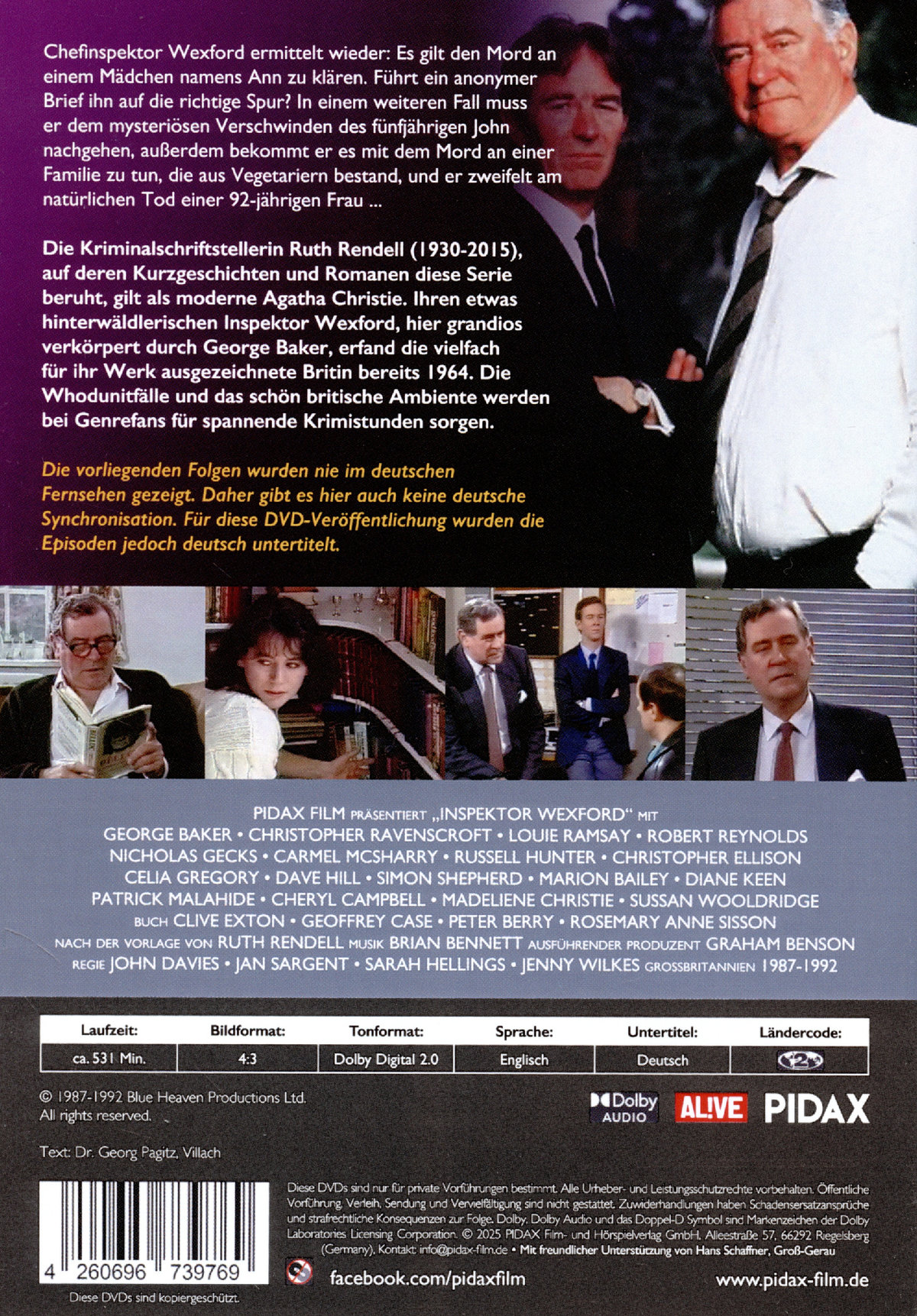 Die Kriminalschriftstellerin Ruth Rendell (1930-2015), auf deren Kurzgeschichten und Romanen diese Serie beruht, gilt als moderne Agatha Christie. Ihren etwas hinterwäldlerischen Inspektor Wexford, hier grandios verkörpert durch George Baker, erfand die vielfach für ihr Werk ausgezeichnete Britin bereits 1964. Die Serie wurde nur einmal vor über 20 Jahren in Deutschland ausgestrahlt. Die Whodunitfälle und das schön britische Ambiente werden bei Genrefans für spannende Krimistunden sorgen. Die vorliegenden Folgen wurden nie im deutschen Fernsehen gezeigt. Daher gibt es hier auch keine deutsche Synchronisation. Für diese DVD-Veröffentlichung wurden die Episoden jedoch deutsch untertitelt.
