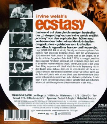 Der Kleinkriminelle Lloyd (Adam Sinclair) ist als zuverlässiger Drogenlieferant ein kleiner Star in der Clubszene Edinburghs. Als er die frisch getrennte Heather (Kristin Kreuk) kennenlernt, verlieben sich beide Hals über Kopf und tauchen gemeinsam in die bunte Welt der chemischen Drogen ein. Doch Lloyds Geschäfte drohen ihm über den Kopf zu wachsen und ein Kurierauftrag kostet ihn fast das Leben. Er beschließt auszusteigen... Mit "Trainspotting" hat sich Irvine Welsh schon zu Lebzeiten und völlig zu Recht einen Kultstatus unter begeisterten Fans gesichert. "Ecstasy" schließt sich entsprechend radikal und packend an und bestätigt Welsh als Meister starker Geschichten und vor Allem: Bilder. Ein cineastisches Highlight nicht nur für Fans! .