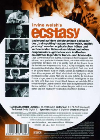 Der Kleinkriminelle Lloyd (Adam Sinclair) ist als zuverlässiger Drogenlieferant ein kleiner Star in der Clubszene Edinburghs. Als er die frisch getrennte Heather (Kristin Kreuk) kennenlernt, verlieben sich beide Hals über Kopf und tauchen gemeinsam in die bunte Welt der chemischen Drogen ein. Doch Lloyds Geschäfte drohen ihm über den Kopf zu wachsen und ein Kurierauftrag kostet ihn fast das Leben. Er beschließt auszusteigen... Mit "Trainspotting" hat sich Irvine Welsh schon zu Lebzeiten und völlig zu Recht einen Kultstatus unter begeisterten Fans gesichert. "Ecstasy" schließt sich entsprechend radikal und packend an und bestätigt Welsh als Meister starker Geschichten und vor Allem: Bilder. Ein cineastisches Highlight nicht nur für Fans! .