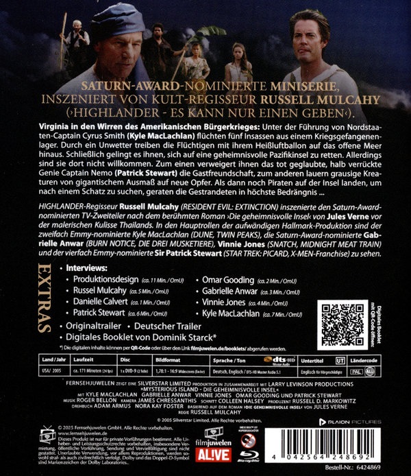 Virginia in den Wirren des Amerikanischen Bürgerkrieges: Unter der Führung von Nordstaaten-Captain Cyrus Smith (Kyle MacLachlan) flüchten fünf Insassen aus einem Kriegsgefangenenlager. Durch ein Unwetter treiben die Flüchtigen mit ihrem Heißluftballon auf das offene Meer hinaus. Schließlich gelingt es ihnen, sich auf eine geheimnisvolle Pazifikinsel zu retten. Allerdings sind sie dort nicht willkommen. Zum einen verweigert ihnen das tot geglaubte, halb verrückte Genie Captain Nemo (Patrick Stewart) die Gastfreundschaft, zum anderen lauern grausige Kreaturen von gigantischem Ausmaß auf neue Opfer. Als dann noch Piraten auf der Insel landen, um nach einem Schatz zu suchen, geraten die Gestrandeten in höchste Bedrängnis ... HIGHLANDER-Regisseur Russell Mulcahy (RESIDENT EVIL: EXTINCTION) inszenierte den Saturn-Award-nominierten TV-Zweiteiler nach dem berühmten Roman „Die geheimnisvolle Insel" von Jules Verne vor der malerischen Kulisse Thailands. In den Hauptrollen der aufwändigen Hallmark-Produktion sind der zweifach Emmy-nominierte Kyle MacLachlan (DUNE, TWIN PEAKS), die Saturn-Award-nominierte Gabrielle Anwar (BURN NOTICE, DIE DREI MUSKETIERE), Vinnie Jones (SNATCH, MIDNIGHT MEAT TRAIN) und der vierfach Emmy-nominierte Sir Patrick Stewart (STAR TREK: PICARD, X-MEN-Franchise) zu sehen.